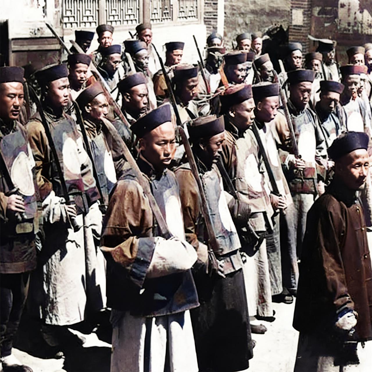 清末时期,一群列队接受检阅的清兵,每人手里攥着一把腰刀,站姿东倒西歪、神情臊眉耷