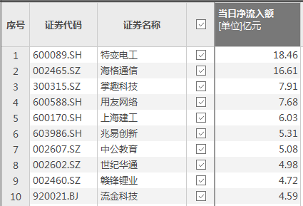 上证报中国证券网讯(记者李雨琪)Choice数据显示,1月13日,资金净流入额排名前十的个股依次是特变电工、海格通信、掌趣科技、用友网络、上海建工、兆易创新、中公教育、世纪华通、赣锋锂业、流金科技。其中,特变电工、海格通信分别获净流入18.46亿元和16.61亿元。