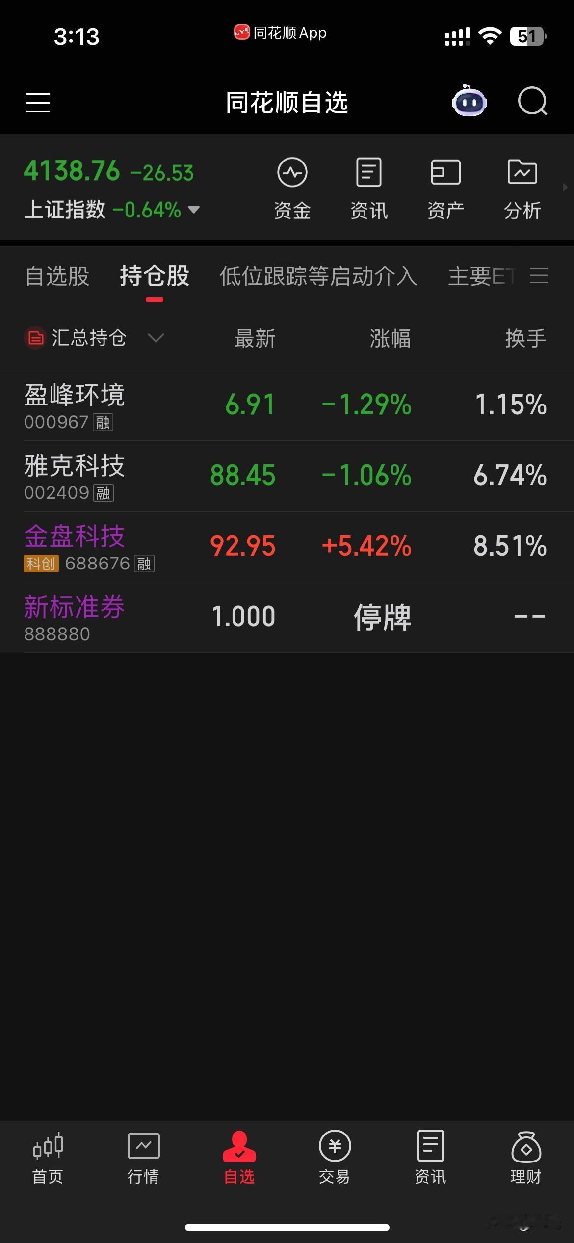 今天大盘终于翻绿,终结17连阳。晚破不如早破,一直不破一直会有回调压力。前期大涨的卫星,ai应用,算力,芯片,机器人等科技板块纷纷回落。下午电网设备突然上拉,相关个股也是纷纷异动。我的金盘上午继续深跌,下午随着电网设备板块上扬也是突然爆拉。我91.5卖了2百股。雅克和盈峰跟随大盘下跌好在幅度不大。收盘总体红了1千7百多。下午开盘不久最多亏近4千。真是冰火两重天。本月股票盈利6千多。今天下午电网设备异动,后期有望催生行情值得跟踪。