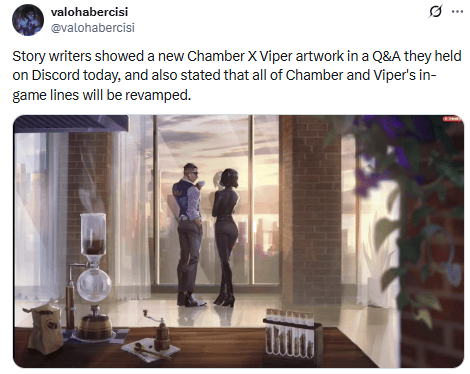 外网博主爆料:“故事作者们在今天举行的Discord问答(Q&A)环节中展示了一张全新的尚勃勒(Chamber)与蝰蛇(Viper)的艺术画作,并表示将对尚勃勒和蝰蛇的所有游戏内语音进行重制。”