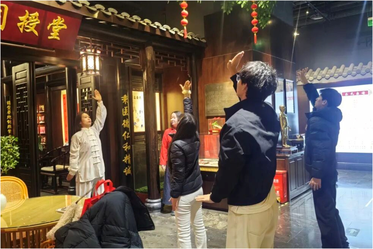 随后开展的八段锦教学成为体验亮点。同仁堂的专业指导老师现场示范,一招一式拆解细致,并结合中医经络理论,阐释每个动作对调理脏腑、疏通气血的作用。师生们跟随练习,在动作舒展中体会传统养生功法的精妙。