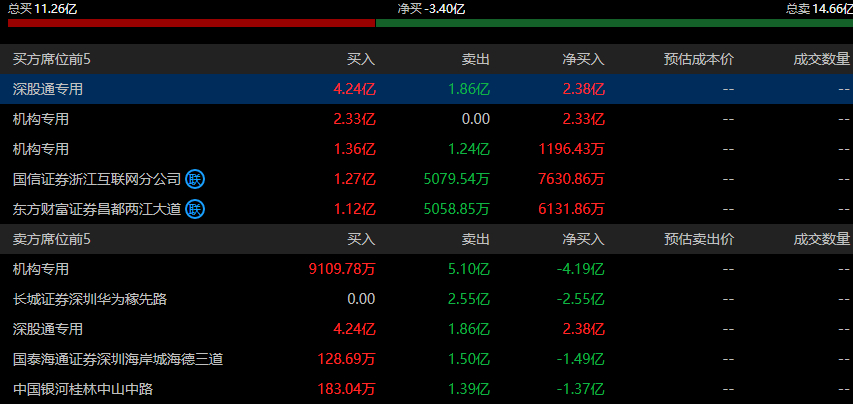 通宇通讯(002792)今日涨4.65%,成交额112.61亿元,换手率50.70%,盘后龙虎榜数据显示,深股通专用席位买入4.24亿元并卖出1.86亿元,2家机构专用席位净买入2.45亿元,有1家机构专用席位净卖出4.19亿元。长城证券(002939)深圳华为稼先路净卖出2.55亿元,中国银河(601881)桂林中山中路净卖出1.37亿元。