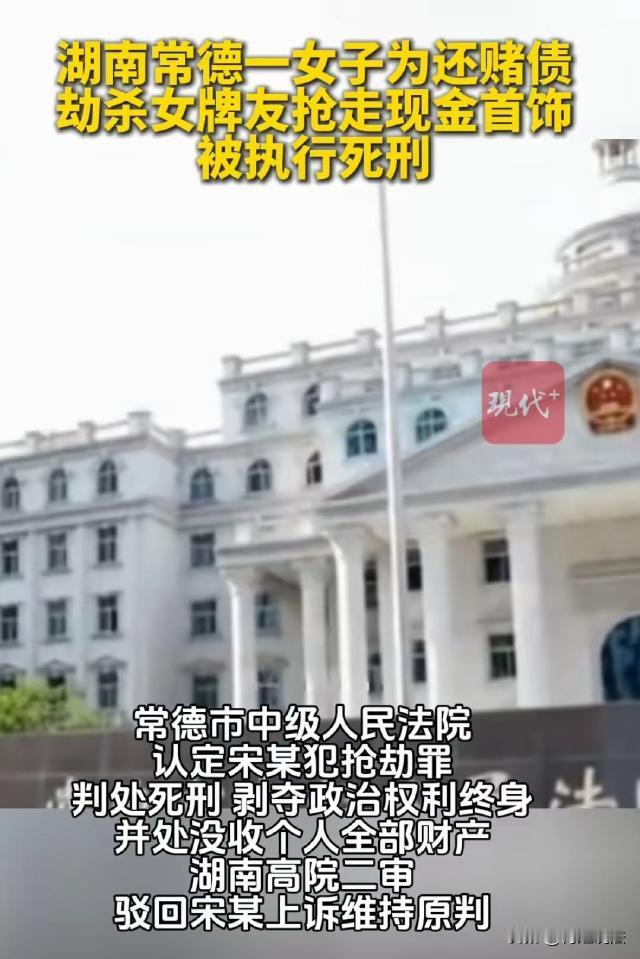 湖南常德,女子欠赌债还不上,听好姐妹讲别人还了她2万块钱,于是打着借钱的幌子去了她家,并提出留宿。趁姐妹睡着,女子拿着一把菜刀将她砍伤,又是掐脖子又是捂口鼻,将好姐妹杀害,随后从她家搜刮出6000多元现金和一些金首饰,又放了一把火毁尸灭迹。可天网恢恢疏而不漏,案发第二天女子被逮捕。 据现代快报报道,宋某是常德市某村村民,生于1971年,案发时刚刚53岁。 宋某嗜赌如命,只要有点空,就到处找人打牌,可她的牌技又不算好,一来二去,欠了别人不少赌债。 女子小莉和宋某是一个村的,两人经常结伴一起打牌,算是兴趣相投的好姐妹。 2023年12月底,眼看快要过年了,宋某的债主纷纷找她要钱,宋某压力陡增。 就在这时候,宋某和小莉闲聊时,小莉说别人刚还了她2万块钱。 说者无心,听者有意,小莉没把这句话当回事,可宋某却听进了心里。 宋某盘算着,小莉手里有2万块现金,她平时穿金戴银,把这些东西一变卖,还能再换不少钱,如此一来,她的外债都可以结清,还能过个好年。 宋某心里暗暗下了个决定,杀掉小莉,将她的钱据为己有! 2023年1月2号晚上,宋某到小莉家,说想借小莉点钱用用。小莉念着两人的情分,拿出5000元现金给了她。 宋某千恩万谢,又提出在小莉家留宿。 小莉一个人在家,宋某留下来,正好可以和她做伴,小莉没有防备,高高兴兴和宋某一起睡下了。 3日凌晨6点钟左右,小莉睡得正香,宋某爬起来,去厨房取了一把菜刀,对准小莉的头猛砍了过去。 小莉惊醒并拼命挣扎,宋某发了狠,用手紧紧掐住小莉的脖子,随后又用被子捂住她的口鼻。 终于,小莉不动弹了,宋某从小莉家里翻出来6000多元现金,又将她价值7.4万余元的金银首饰搜刮一空。 随后,为了毁尸灭迹,宋某放了一把火才逃离现场。 第二天,宋某被抓获。没多久,宋某因抢劫罪被被判处死刑,剥夺政治权利终身,并处没收个人全部财产。 宋某杀害了小莉,为什么被判抢劫罪,而不是故意杀 人罪? 《刑法》第二百六十三条规定,以暴力、胁迫或者其他方法抢劫公私财物的,构成抢劫罪。 第二百三十二条规定,故意非法剥夺他人生命的,构成故意杀 人罪。 区分这两个罪名的关键,在于行为人的主观目的,和行为的主要特征。 从主观目的来看,宋某实施犯罪的起因是欠下赌债,听闻小莉有2万块钱以及她有金首饰,为了获取财物以偿还债务,才产生了犯罪意图。 宋某去小莉家借钱、留宿等一系列行为,都是为最终抢劫财物做铺垫。 虽然宋某实施了杀 害小莉的行为,但这一行为是其为了排除障碍、获取财物的手段,并非单纯以剥夺小莉生命为目的。 从行为特征来看,宋某在杀 害小莉后,立即从小莉家中翻出6000多元现金和价值7.4万余元的首饰并逃离现场,宋某行为的核心是通过暴力手段劫取他人财物,符合抢劫罪的构成要件。 如果是单纯的故意杀 人罪,行为人通常不会在杀人后立即实施劫取财物的行为,或者劫取财物并非其主要目的。 因此,宋某的行为更符合抢劫罪的构成特征,而非故意杀 人罪。 《刑法》第二百六十三条规定,抢劫致人重伤、死 亡的,处十年以上有期徒刑、无期徒刑或者死刑,并处罚金或者没收财产。 宋某的行为符合这一加重情节,且具有多个严重的情节。 首先,宋某是预谋作案。 宋某在得知小莉手中有钱和首饰后,便暗暗决定杀掉小莉并占有其财物,经过了精心的策划和准备,主观恶性极大。 其次,宋某实施的是入户抢劫。 入户抢劫严重侵犯了公民的住宅安全和人身、财产权利,社会危害性远大于一般的抢劫行为。 再者,宋某在抢劫过程中致一人死 亡,这是极其严重的后果,剥夺了他人的生命权。 同时,宋某抢劫数额巨大,其劫取的财物包括6000多元现金和价值7.4万余元的金银首饰。 最后,宋某为掩盖罪行焚尸灭迹,犯罪情节特别恶劣,手段残忍。 因此,一审直接判宋某死刑。 一审判决后,宋某认为量刑过重,提出上诉。二审维持一审宣判,驳回宋某上诉。 不久前,经最高法核定,宋某已被压赴刑场执行了死刑。