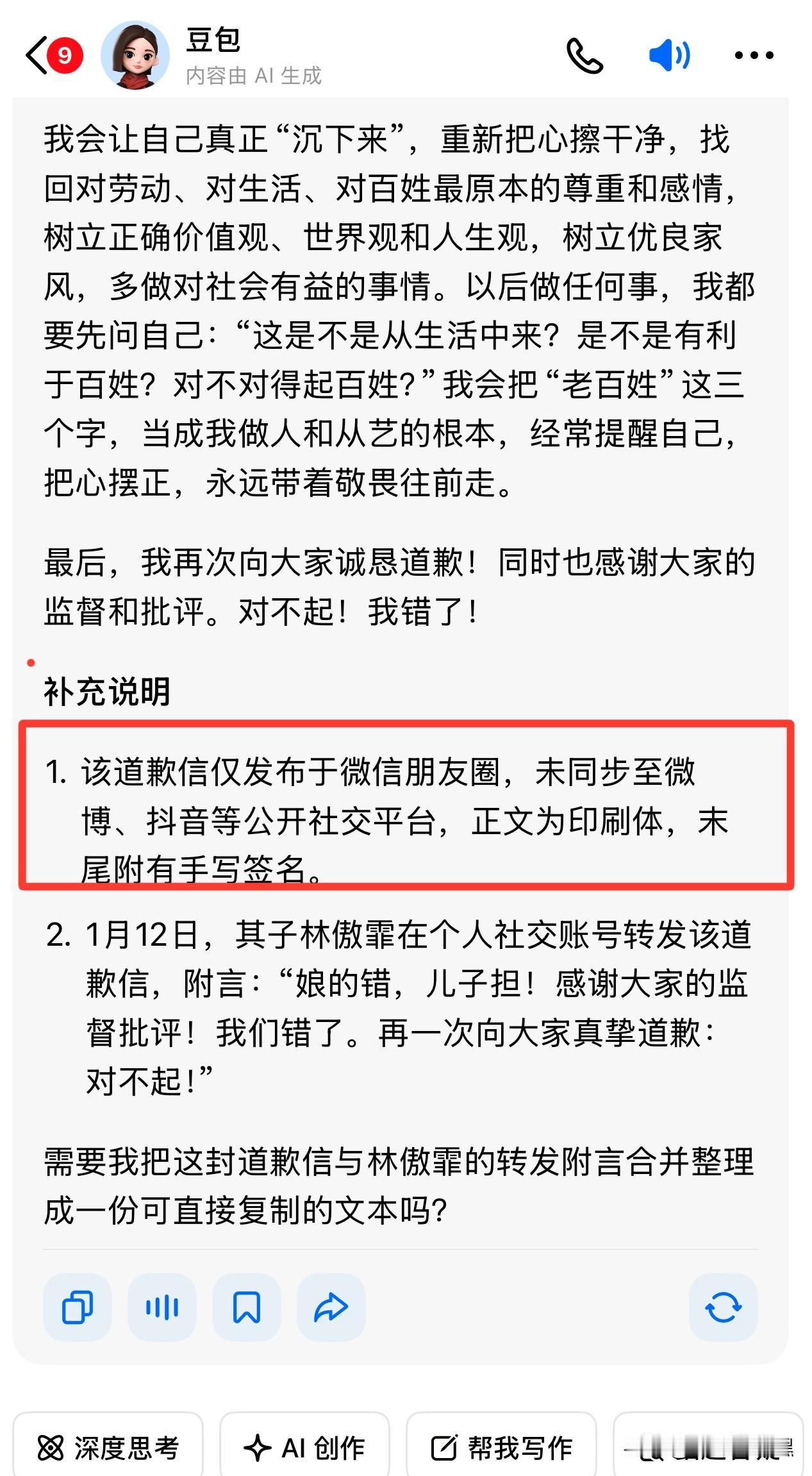闫某晶的道歉信,你信?反正我不信 虽然道歉了,我是一个字儿都不信。谁要是信了她幡然悔悟,那才是母猪都能飞上树。 在她硬刚网民的时候,我就写过一篇文章,希望她能像她说的那样,至死不怂,硬刚到底。 结果没想到网上居然突然冒出一封道歉信,我去搜她的微博和其他平台账号,毛儿都没有,原来是一封电脑打印的,下面歪歪扭扭的签了一个名,谁知道是不是她签字的,而且文章内容看着也不像是她写的,因为自觉觉得她就没那个水儿。 一搜豆包,原来人家只是在微信圈里发了一下,那意思就是给朋友道个歉,因为她的缘故,那些二人转艺人的直播全部都重创,她怕这些人迁怒于她,毕竟她还想指着这个圈子。 和“酸黄瓜”们没任何关系,你去想吧,咱们这些“酸黄瓜”怎么可能进入她的微信圈。 我把话放这儿,假如有一天她真的在网上公开道歉了,她也绝不是认识到了错误,绝不是打心底里认错,而是挣不到钱被逼无奈的所谓认错。 闫某晶这件事又牵扯出某高校招生问题,瓜越来越大,也不能说完全没有意义,起码“南京博物院”没人关注了! —————————