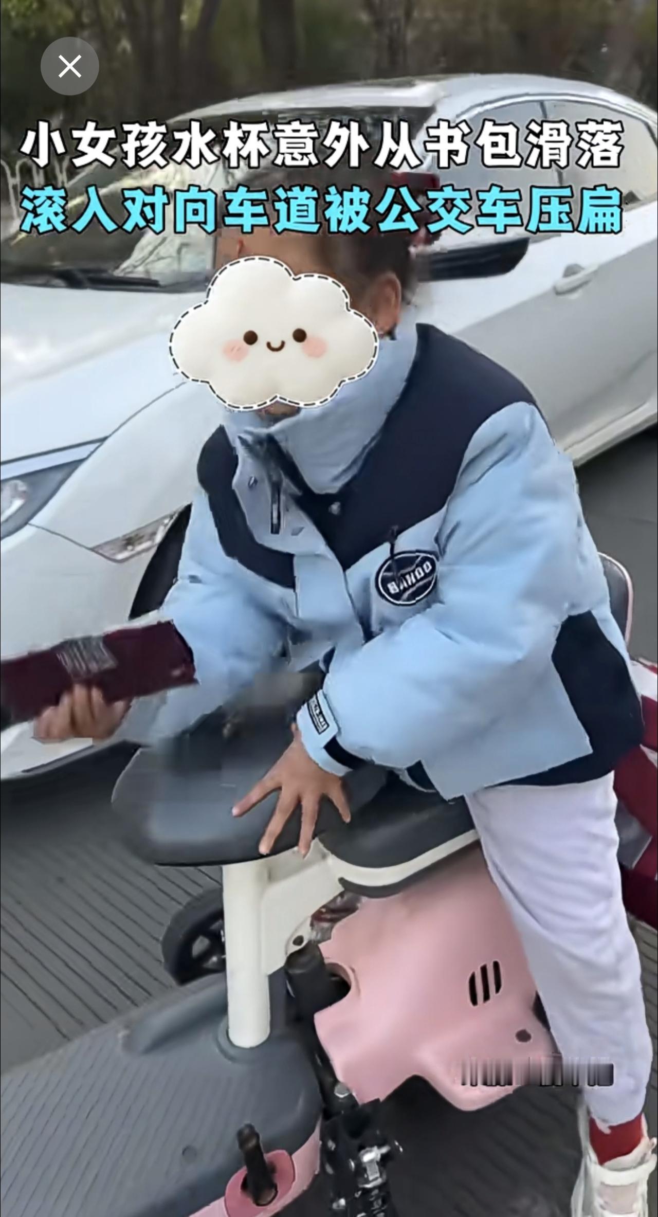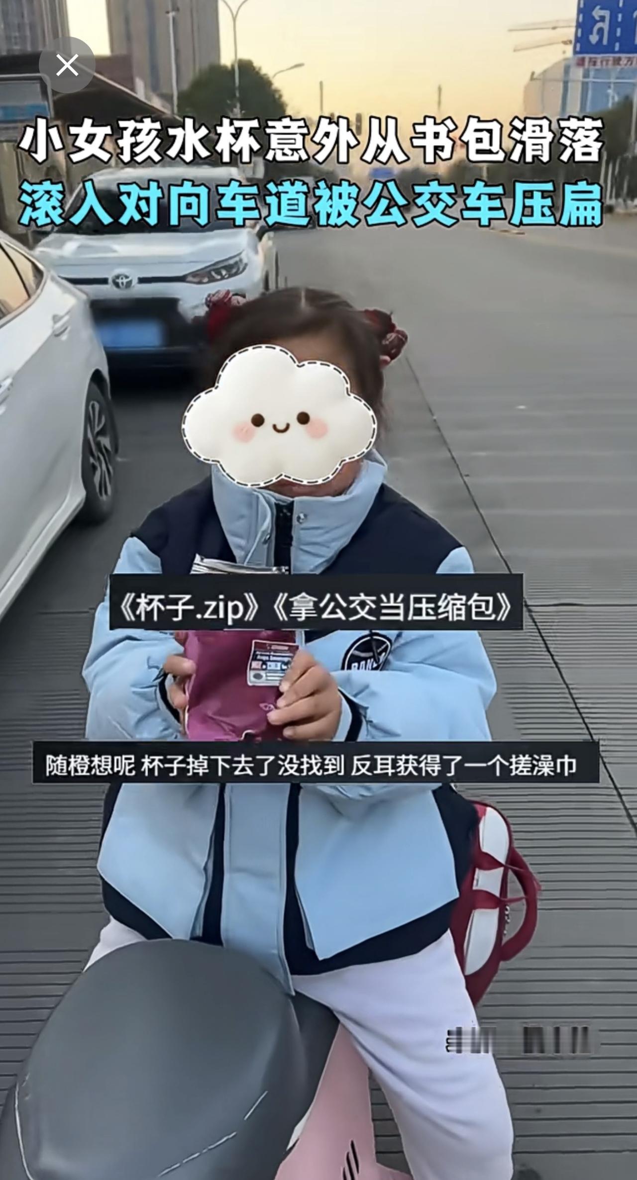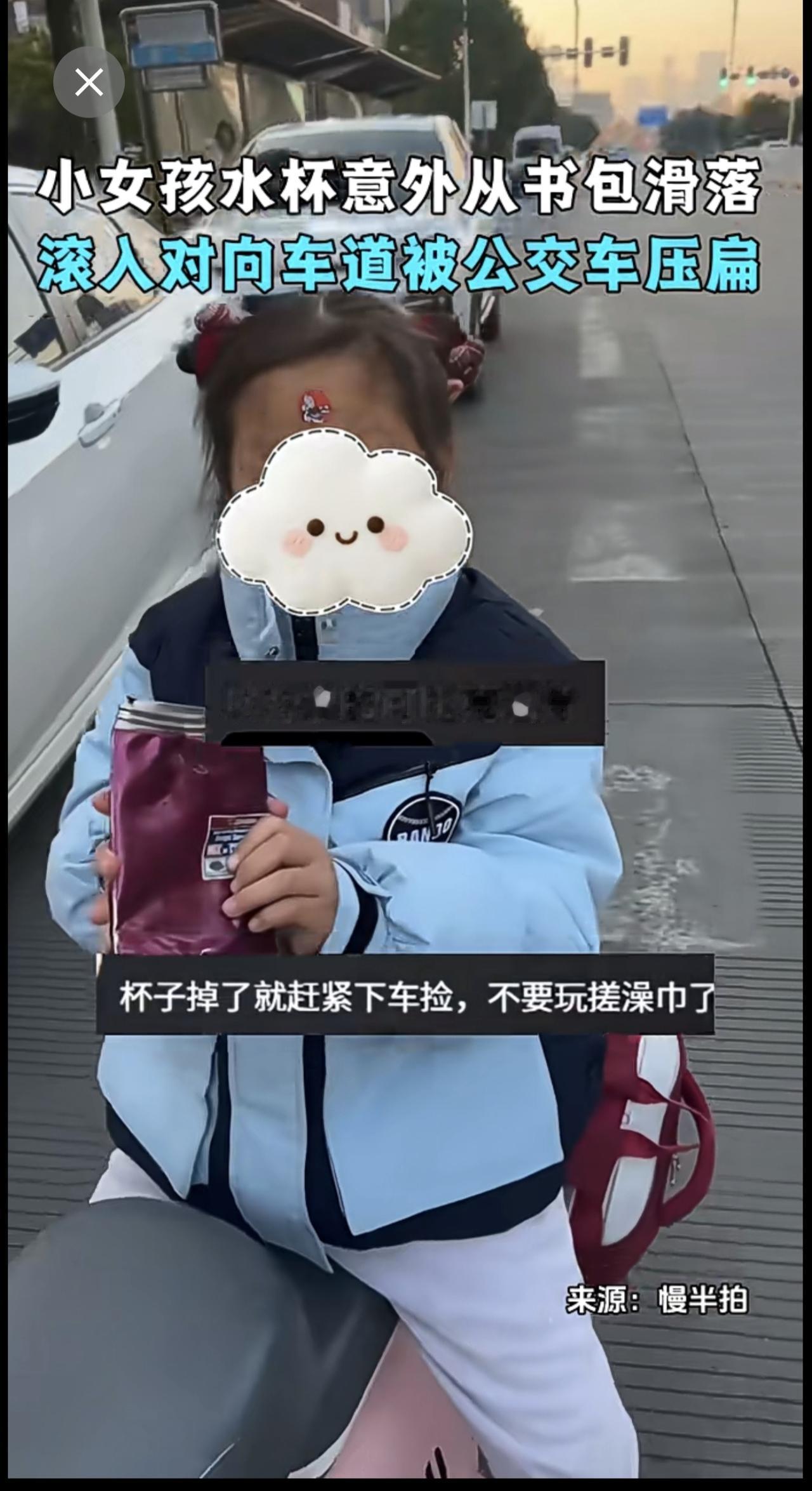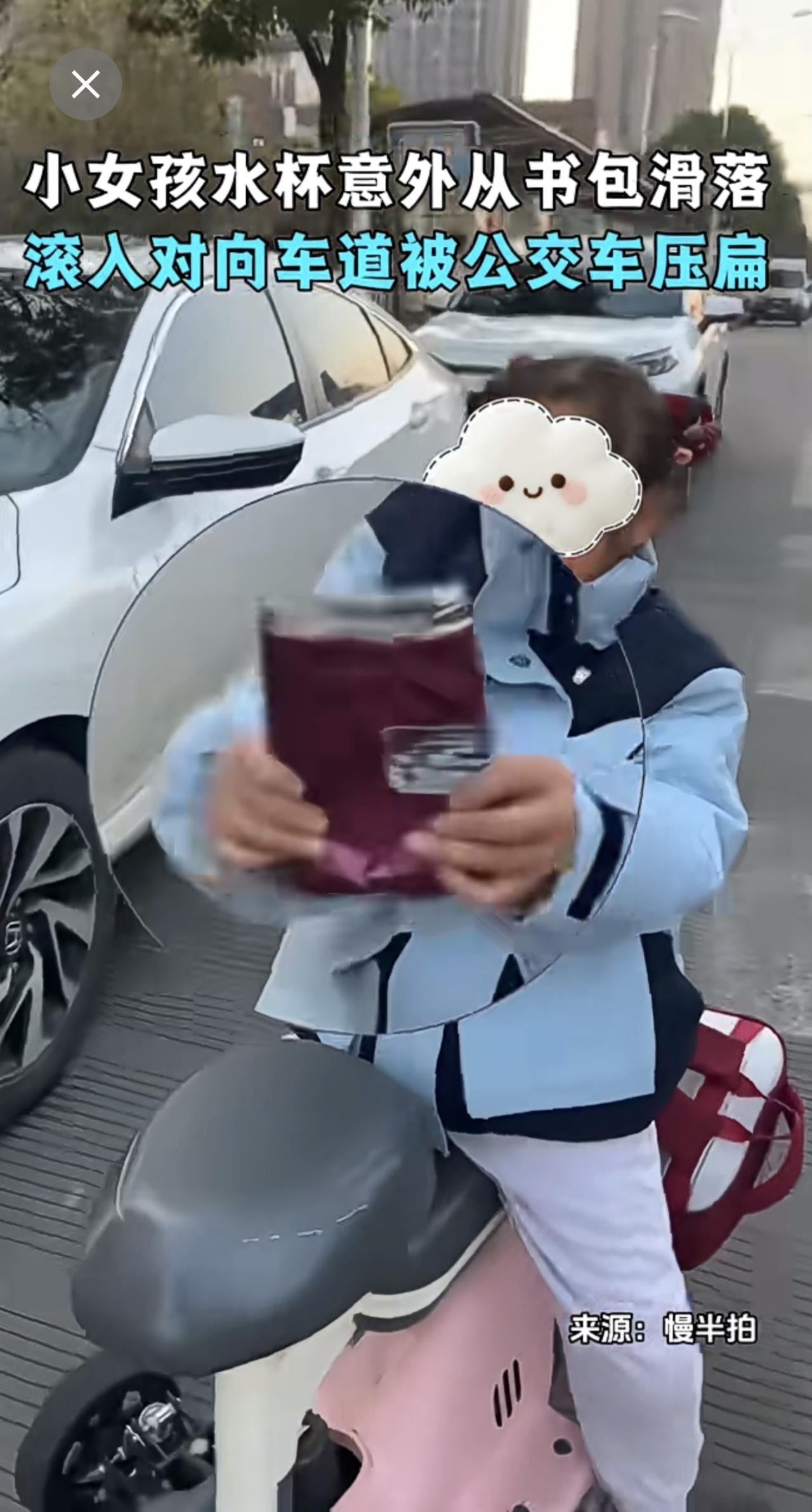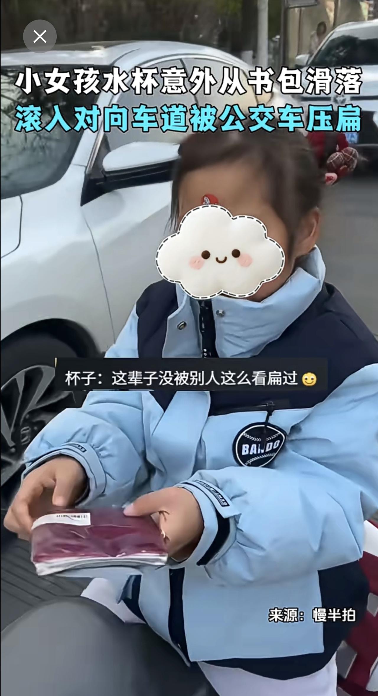 13日(报道时间),放学路上,一名小女孩的水杯从书包侧边掉出来,滚到对向车道上,随即被路过的公交车压扁。网友:“杯子掉了就赶紧下车捡,不要玩搓澡巾了。”水杯