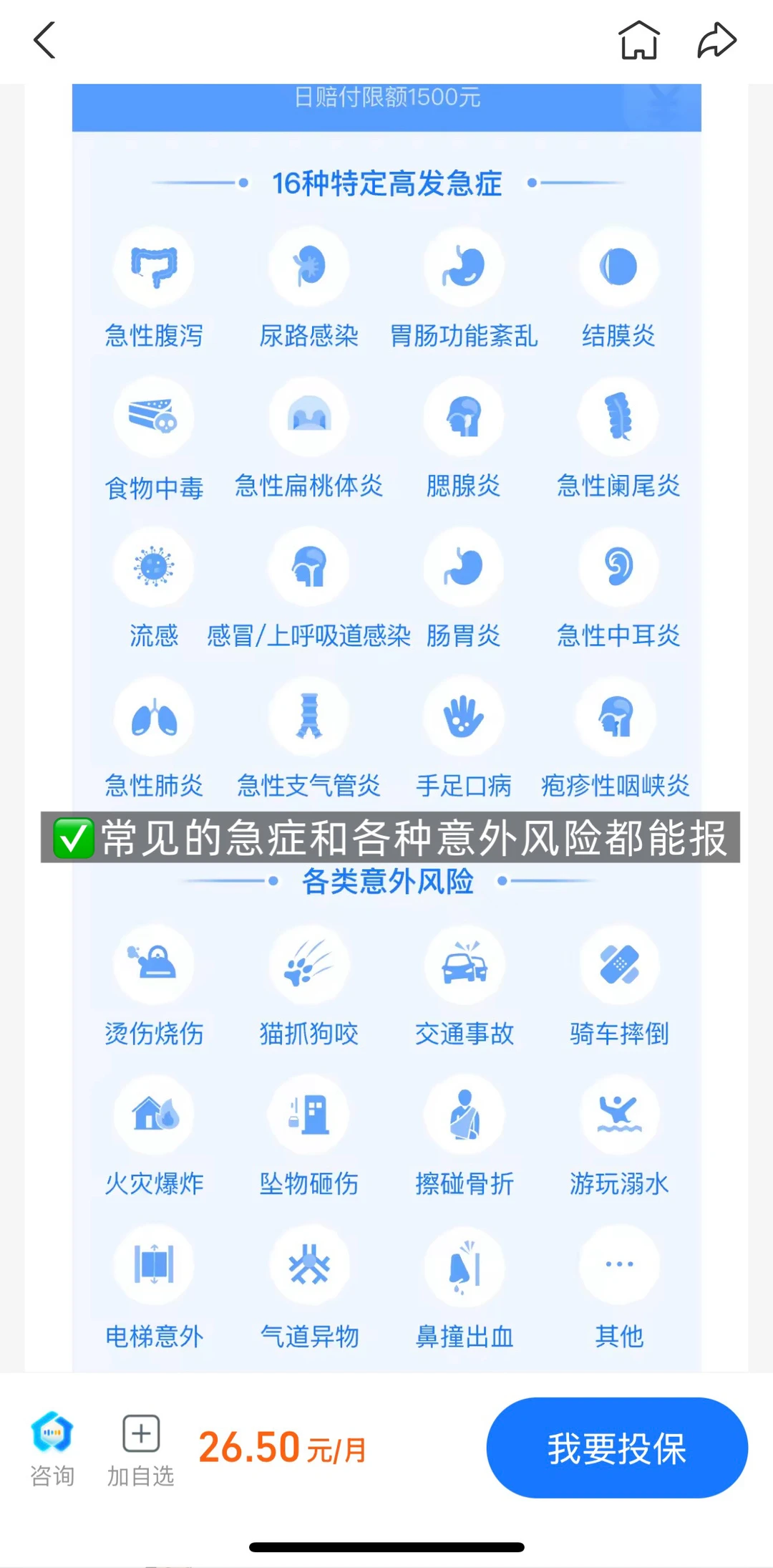 常见急症比如感冒、肠胃炎都能报,各种意外风险比如骑车摔倒也能报,按80%比例报销;一般疾病门急诊,比如皮肤敏感、鼻炎等,按50%比例报销。