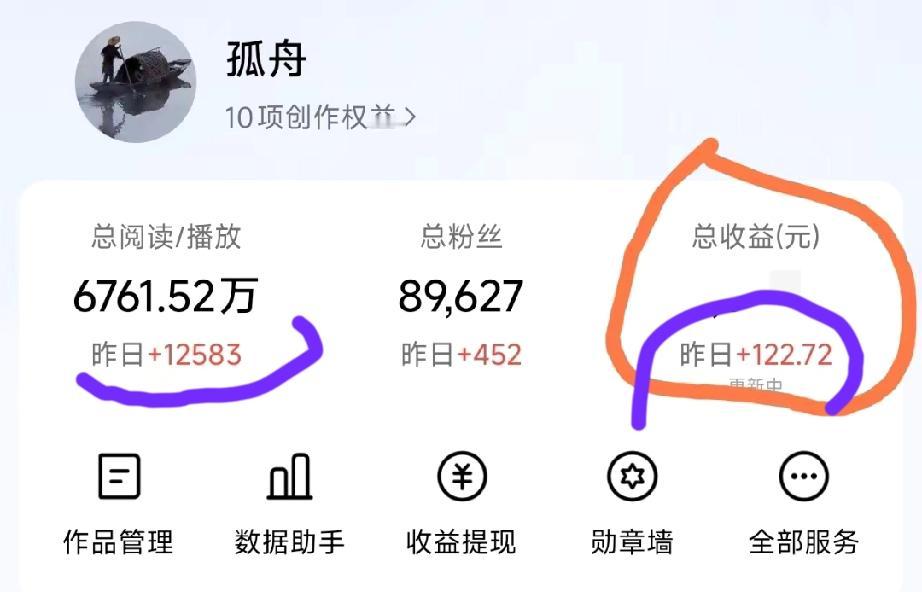 有位叫孤舟的友友可能要火起来,因为他的阅读单达到了10元,头条头部作者素老三的收益单价可能也只有这么多。 在头条火不火?主要看单价,因为单价高、就意味着其账号权重高,是头条重点扶持的对象。 大家可以算一算账,千次阅读单价是10元,一万阅读量就是100元,一个顶部头条创作者每天只要达一两万的阅读量,其收益就是两百块,这就是头条高收益的来源! 刚才刷到了孤舟晒收益的微文,他昨日的阅读量是12583,其收益就是122.72元,看到这样的收益,他说他非常满意! 这位叫孤舟的友友在微文中说、创作没有技巧,要坚持日更,每天要多写几篇,能写几篇就写几篇,说不定那一篇爆了,就会有了高收益。 不过我不完全同意他的观念,他之所以会成功,我认为除了他的真本事之外、他还碰上了好运气。 这段时间头条晒收益的文章比较稀缺,以前一些晒收益的不晒了,比如素老三,还有几位就不提名子了,而孤舟正好补上这个空缺,更妙的是孤舟的创作领域正好与收益有关,于是头条就顺理成章的提高了他的账号权重,给了他非常高的10元收益单价,孤舟这位友友只要能稳住,又没有合适的竞争对手,他很快就能大红大紫起来。 友友们!如果你想大红大紫,就必须在平时打造好自己的账号,如果哪位网红不行了,其位置有了空缺,你只要有顶上去的真实本领,能稳住就成功了?