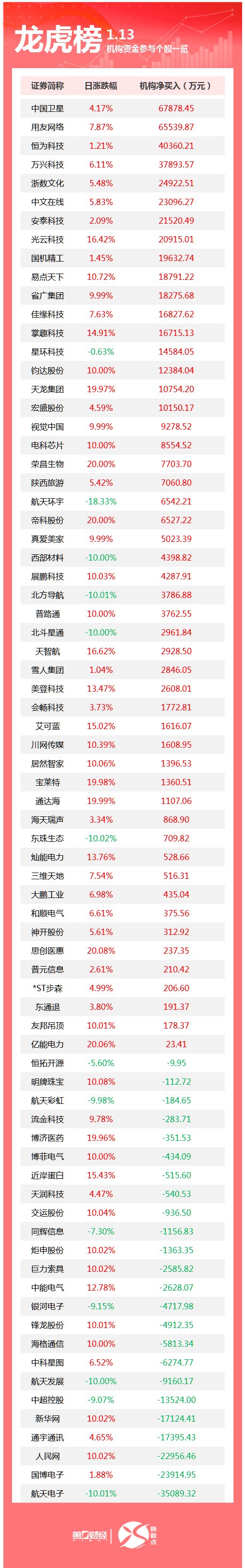 盘后数据显示,1月13日龙虎榜中,共75只个股出现了机构的身影,有51只股票呈现机构净买入,24只股票呈现机构净卖出。