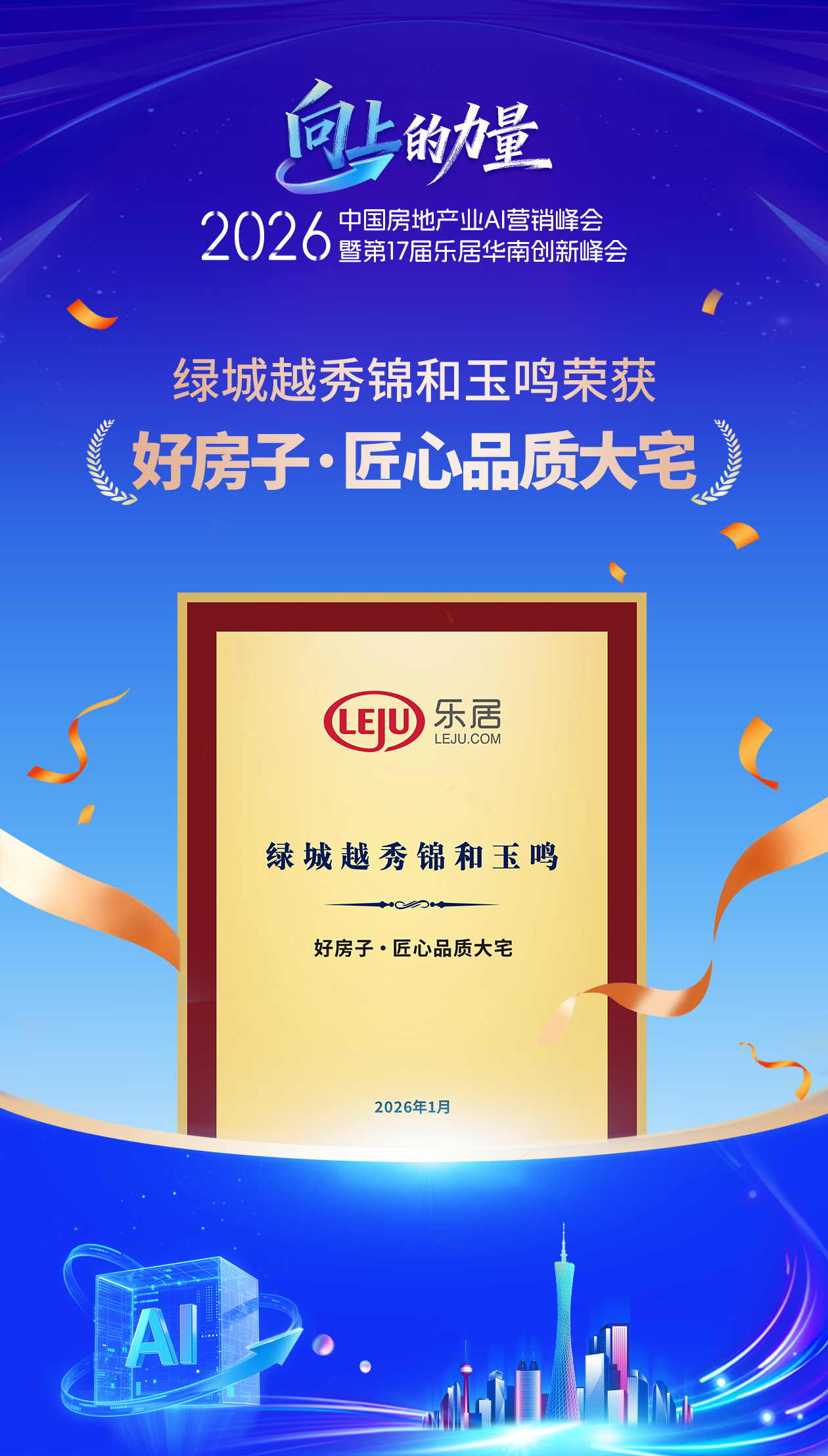 1月13日,“向上的力量”——2026中国房地产业AI营销峰会暨第17届乐居华南创新峰会”在广州隆重举行。