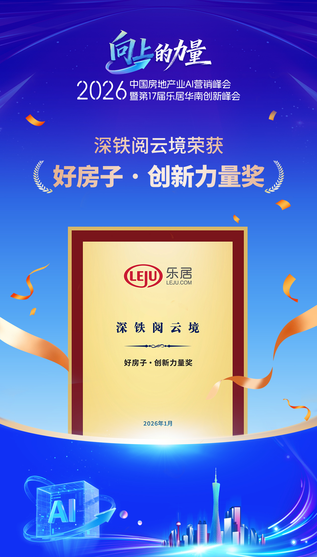 1月13日,“向上的力量”——2026中国房地产业AI营销峰会暨第17届乐居华南创新峰会”在广州隆重举行。