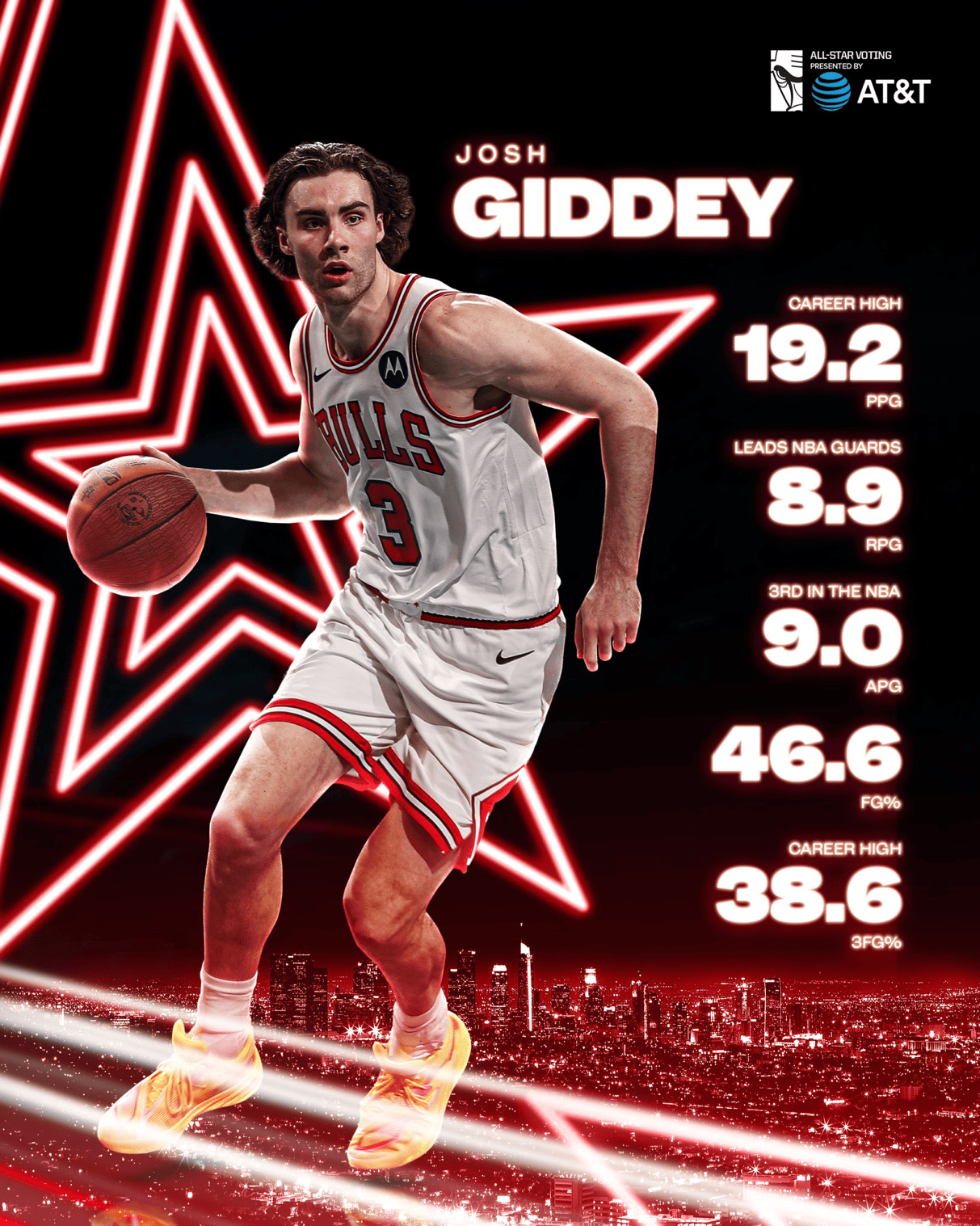 “全联盟仅有两名球员场均贡献19分、8.5篮板和9.0助攻:约什-吉迪和尼古拉约基奇。”公牛官媒附文道。