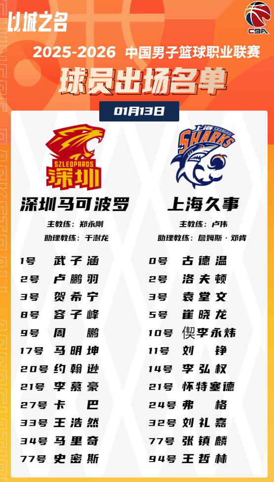 虎扑01月13日讯今晚CBA常规赛,深圳对阵上海的大名单已经公布。