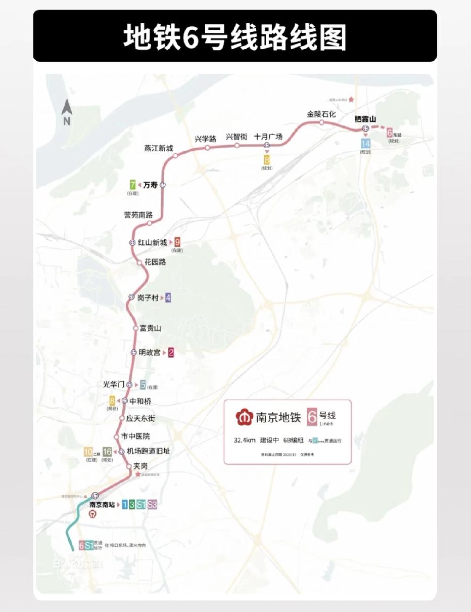 好消息,南京地铁6号线要来啦! 正式开通时间暂定在2026年3月底或4月初,目前线路已进入试运行阶段,跑图计划已初步敲定! 此次跑图将分两个阶段推进(具体以实际执行为准): 1. 1月18日至2月6日:投入21列车,以栖霞山站—夹岗站为交路开展基础运营测试; 2. 3月1日至3月20日:列车数量增至42列,同时开启大交路(栖霞山站—空港新城江宁站)、小交路(万寿站—禄口机场站),以及栖霞山站—无想山站的三线贯通交路测试,全面验证线路运营能力。 南京地铁6号线全长约32.4公里,西起栖霞山站,东至南京南站,串联栖霞、玄武、秦淮、雨花台等区域,途经明故宫、市中医院等重要点位。 线路开通后,将大幅缩短城北与城南的通勤时间,进一步完善南京地铁线网的互联互通。南京地铁 六号线通车 六号线地铁盘