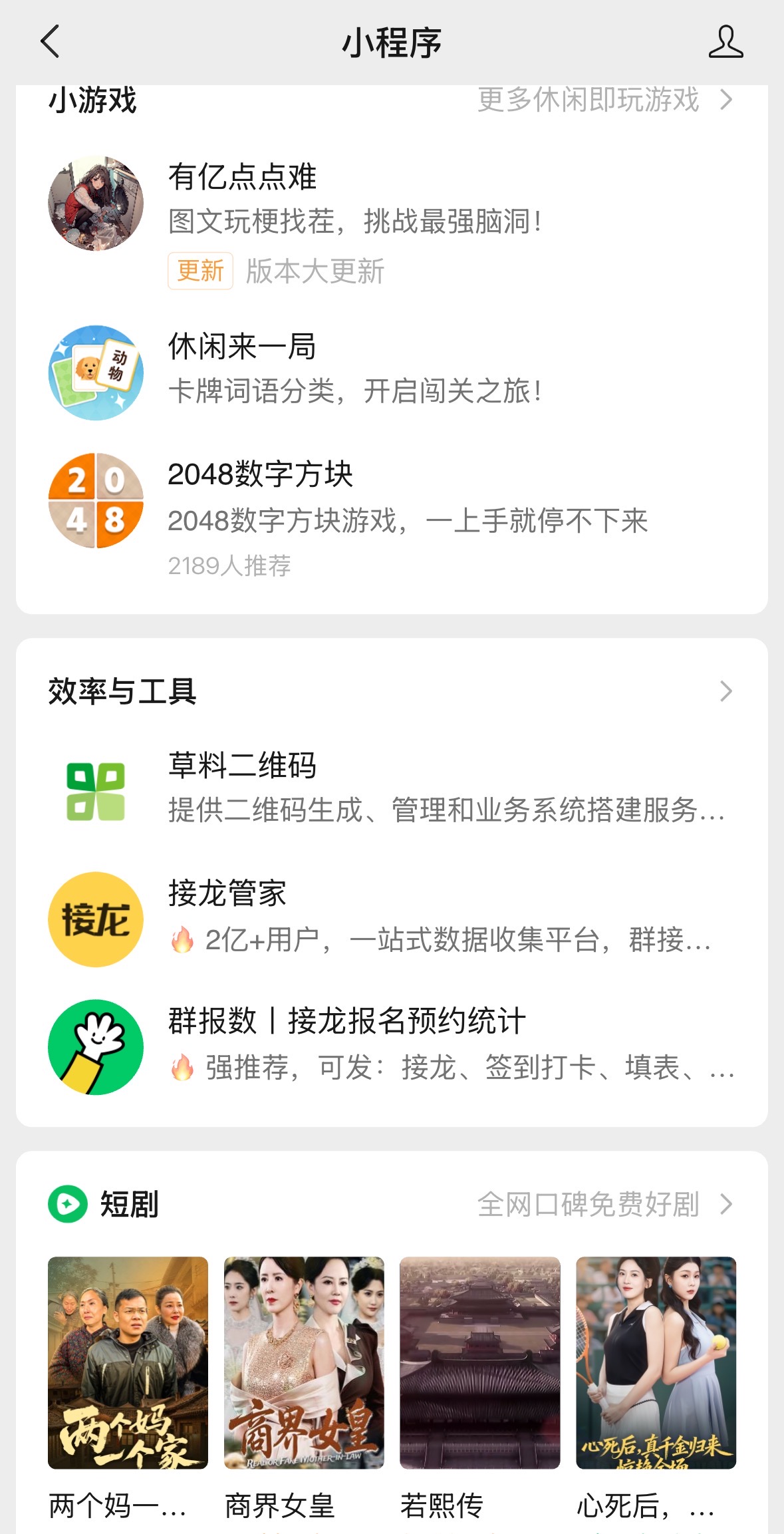 [亿邦原创]亿邦动力发现,微信小程序页面迎来重大改版。用户点击“发现”进入“小程序”,该入口在原有“最近使用”“我的常用”“门店快送”三大聚合页基础上,新增“影视与音乐”“兴趣交友”“潮玩动漫”“小游戏”“效率与工具”“短剧”“附近合集”七大板块,覆盖内容消费、社交娱乐、本地服务等多元场景。