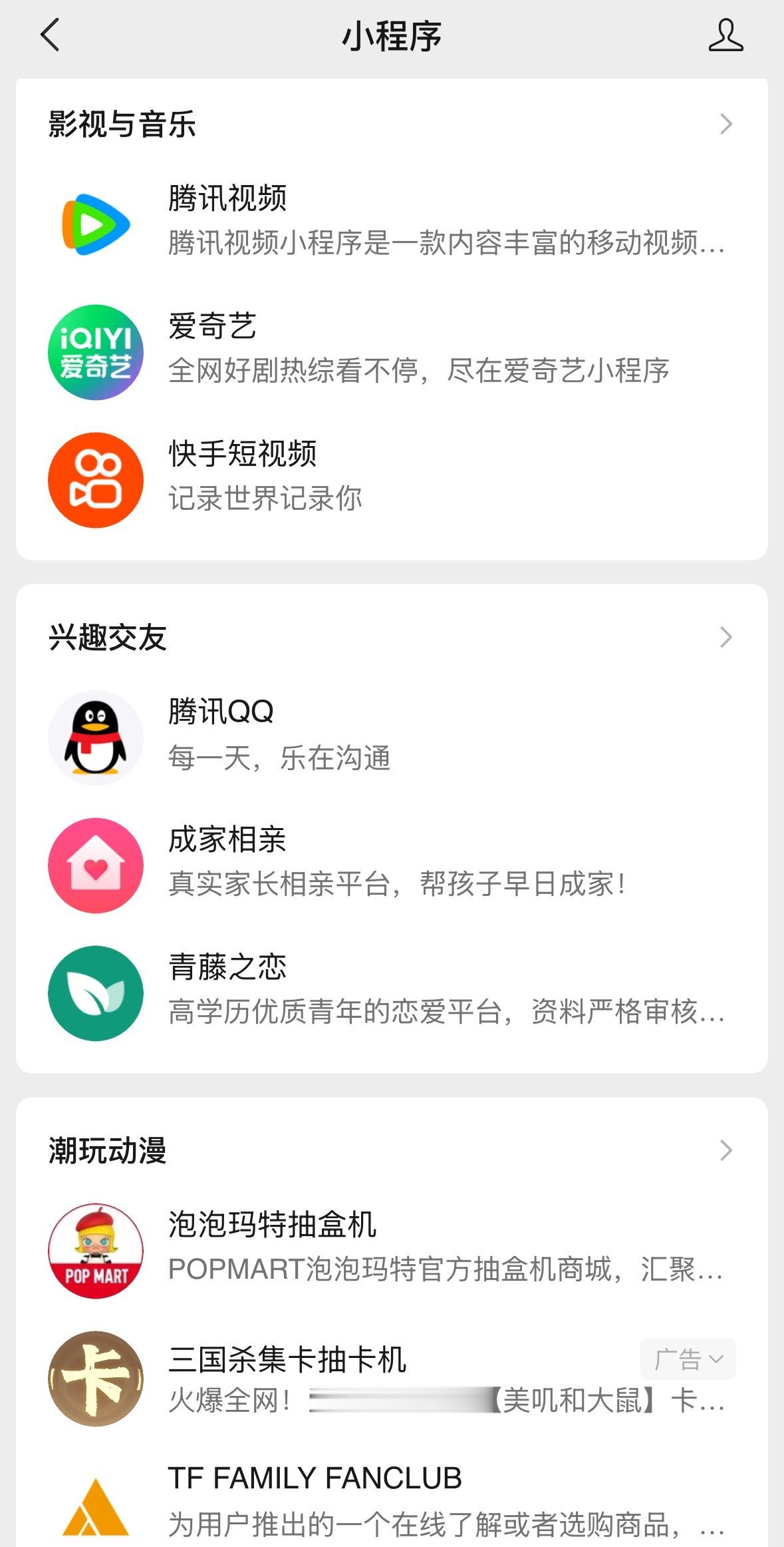 本次新增的七个聚合页面,主要涵盖两个方向。其一是内容消费与社交娱乐场景,“影视与音乐”“短剧”“小游戏”契合当下用户碎片化娱乐需求,短剧则凭借“低成本、高爽感”成为内容消费新风口。“兴趣交友”“潮玩动漫”板块,是小程序对社交场景的进一步延伸,通过兴趣标签实现用户精准匹配,强化生态内的社交粘性。