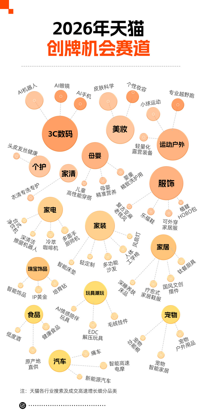 年度新品牌发展报告还同时发布了2026年50个蓝海机会赛道:智能机器人、AI眼镜、皮肤科学、个性妆容、可外穿家居服、植鞣HOBO包、家装轻定制、智能床垫、钛餐厨具、小球运动、轻量化运动装备、专业越野跑、宠物户外等,当前用户搜索及购买热度持续上升,品牌增长空间较大。
