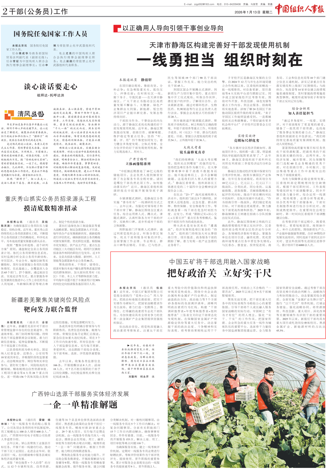 1月13日,《中国组织人事报》第2771期刊发文章《中国五矿将干部选用融入国家战略把好政治关立好实干尺》,介绍中国五矿干部队伍建设经验做法。全文如下: