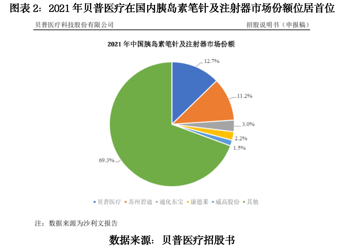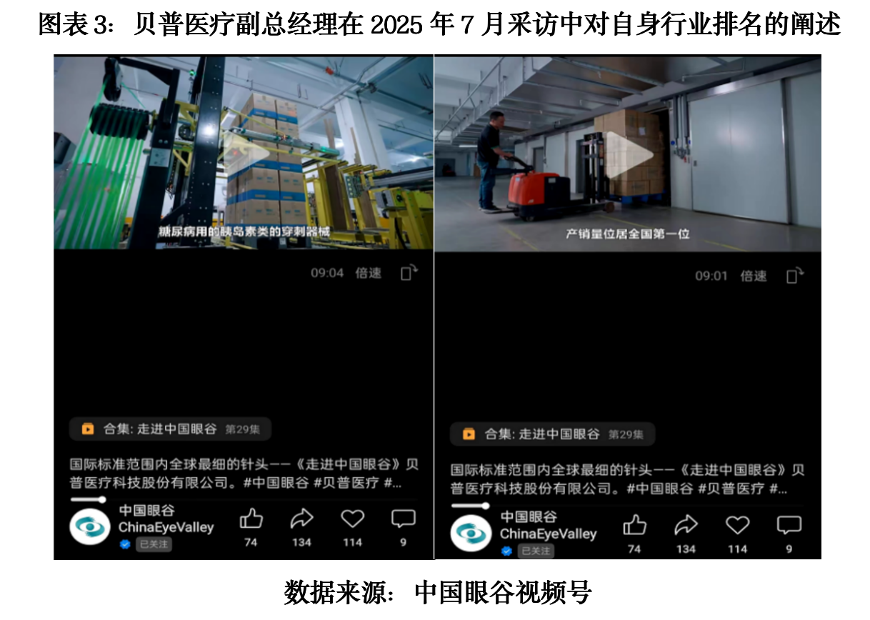 而2025年7月,另一家同行企业贝普医疗科技股份有限公司(下称“贝普医疗”)的创始人兼副总经理王兴国在采访视频中则表示,贝普医疗糖尿病用的胰岛素类的穿刺器械产销量位居全国第一位。此外,在贝普医疗的招股书中,根据弗若斯特沙利文研究数据,贝普医疗2021年胰岛素注射相关产品(含胰岛素注射笔针、胰岛素注射器)的市占率在国内居行业首位。