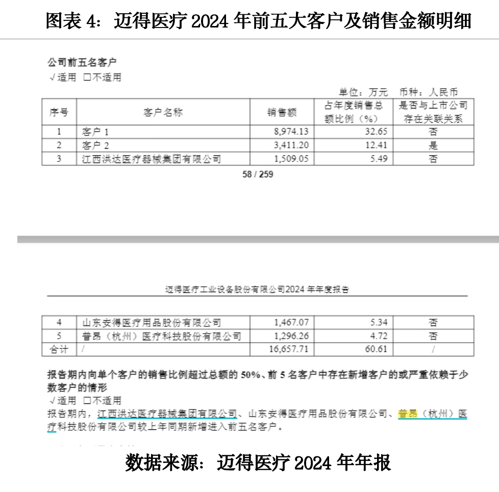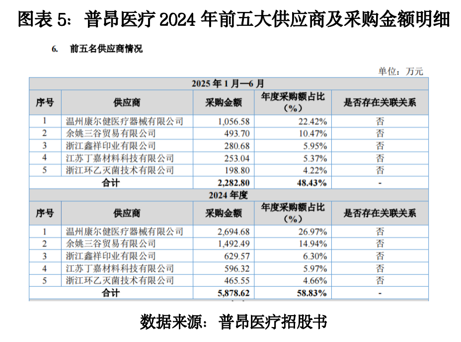 但招股书显示,2024年,普昂医疗来自第五大供应商的采购金额为465.55万元,且前五大供应商中没有迈得医疗的身影。