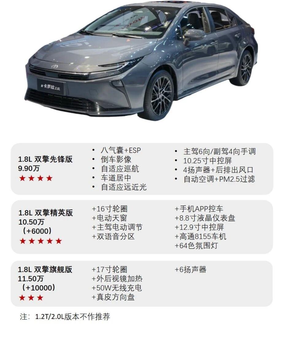 只卖9万9的混动长轴版卡罗拉!到底香不香?即便是经典得不能再经典的卡罗拉 如今也要靠堆配置和更新换代来追赶国产车的节奏了 不过这一次卡罗拉的中期改款还是有些诚意的 加长轴距(实际上就是把亚洲狮顶上卡罗拉的位置了)、主打混动 价格来到了只要9.9万的门槛 它还值得买吗?哪个配置更划算呢? 小迪赶紧带大家来看看~ 基本参数 车身尺寸:4710/1780/1435(mm) 轴距:2750(mm) 动力系统:1.8L THS 百公里油耗:4.13L/4.17L/4.45L 底盘:前麦弗逊/后双横臂 配置推荐 1.2T版本的配置太低、2.0L版本价格太高 也没有额外的插混版本车型 所以这两种动力版本基本都不用看了 直接看1.8L混动版本的三个配置 入门的先锋版安全和动力配置都是满的 但是舒适性配置太素,适合做网约车或者出租车 顶配的旗舰版和精英版差价足足1万 但是配置距离拉的不够开 所以直接无脑上精英版就可以了~ 价格方面,虽然精英版只要10.5万 但是换成其它家已经可以买可充电的新能源了 更不用提足足大一圈的其它国产车 所以在目前价格基础上再优惠1-1.5万会更合适~ 你觉得这台新卡罗拉怎么样呢? 哪个配置更划算呢? 欢迎积极留言哦~