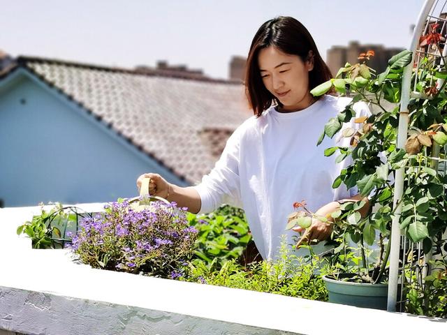 园艺达人大卷给露台上的花草浇水。陈玺撼摄