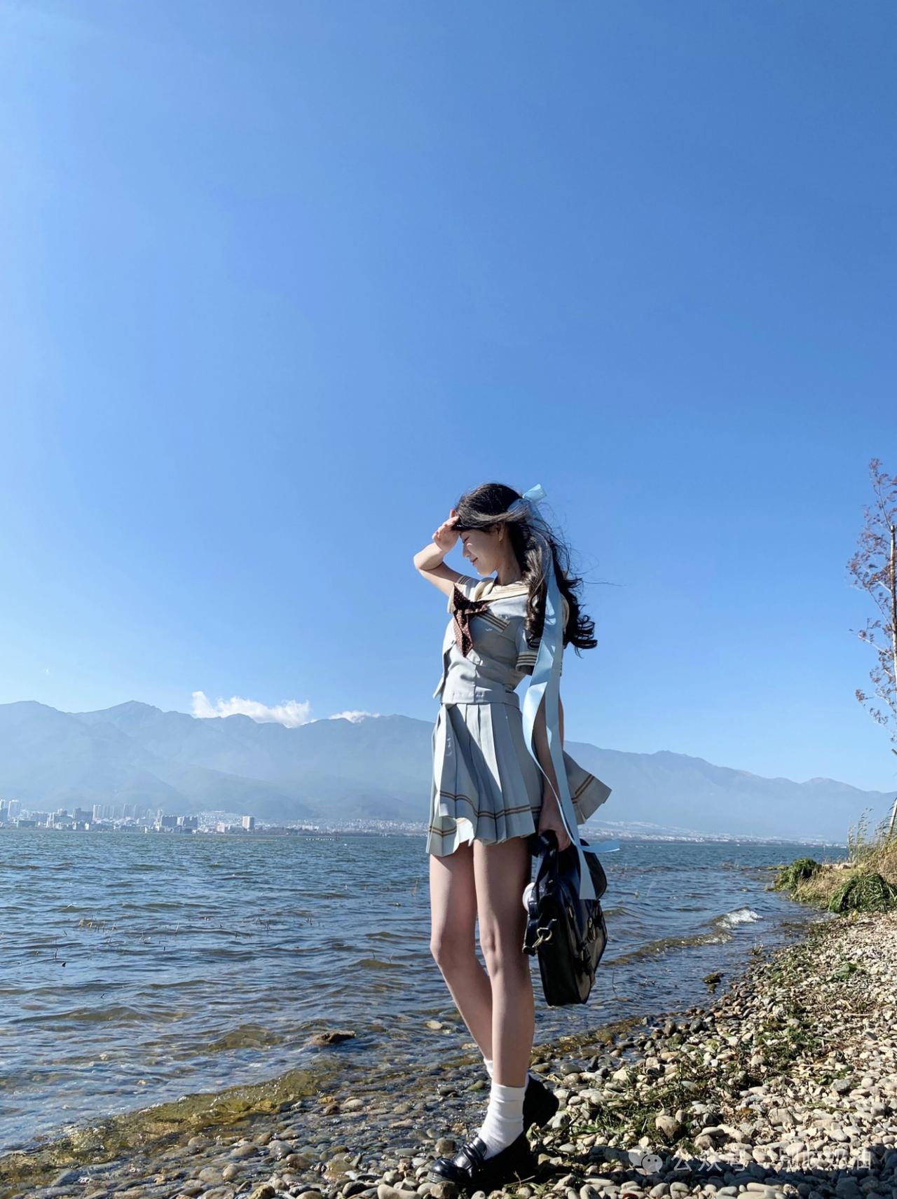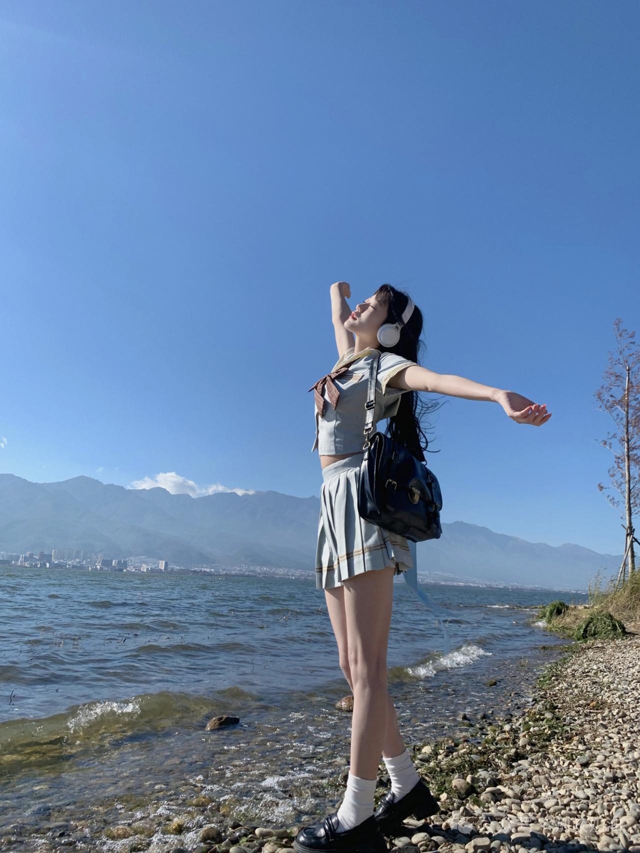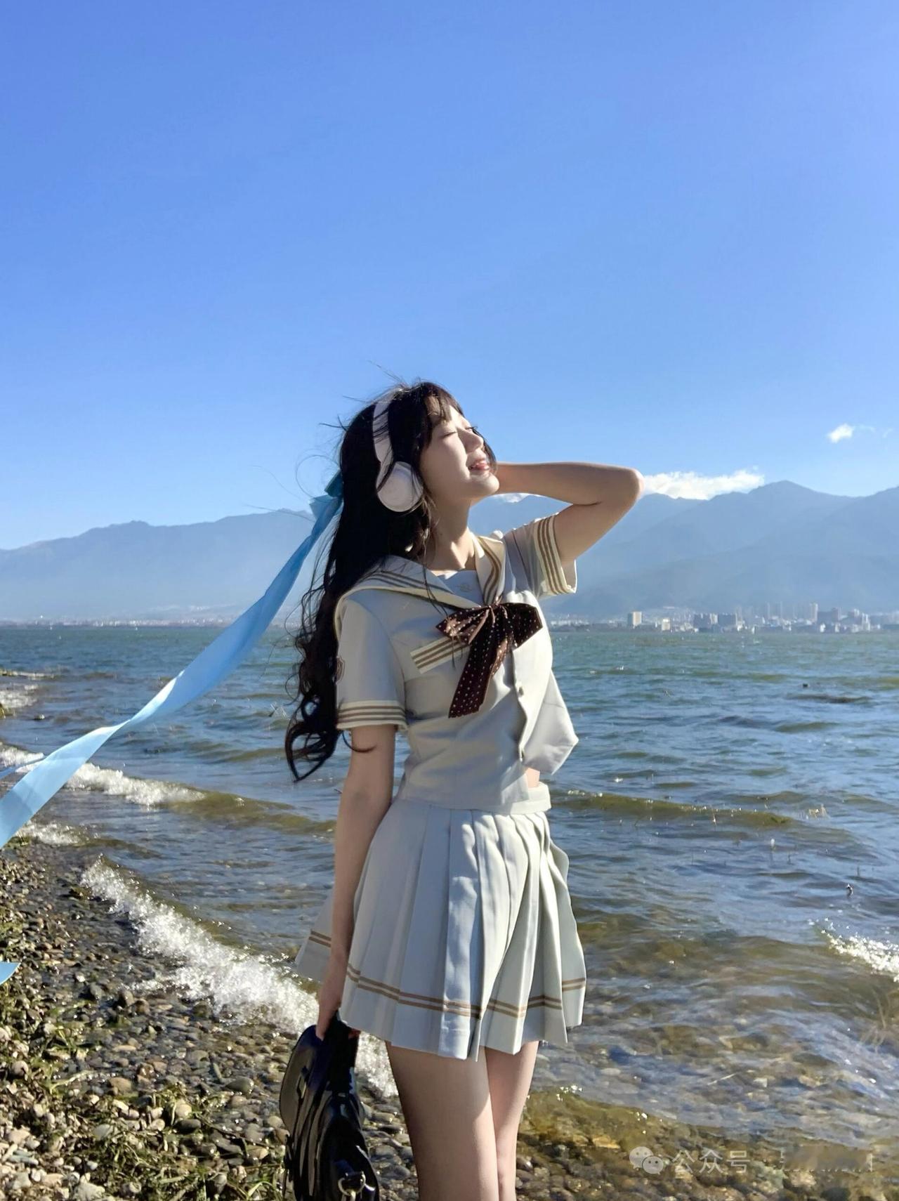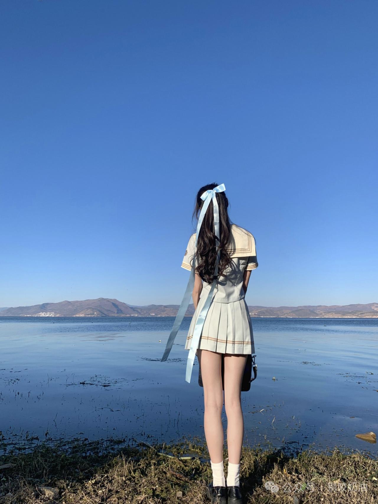海风把蓝色丝带吹成温柔的形状,山海之间,少女的心事都融进这一片澄澈的蓝里