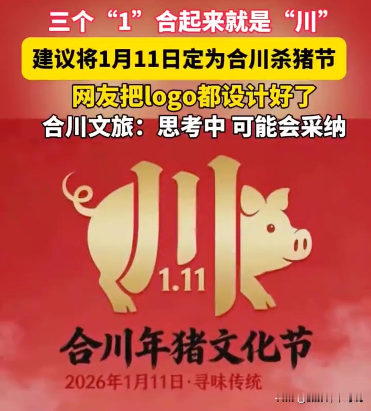 合川杀猪节被网友设计出了LOGO,由此可见呆呆的刨猪饭威力有多大,几乎一夜期间风靡全网!只不过这个LOGO的含川度是不是有点高了?老铁们看到这个LOGO的第一印象会以为这事儿发生在重庆还是四川?不用多说,几乎绝大多数人都会认为是四川的一个杀猪节。在网上一提到“川”大家自然而然的都会想到四川,而不是合川。所以,我觉得这个LOGO的设计理念很不错,但是意思表达有点儿不准确吧。如果合川真采用这个LOGO,估计第一个不答应的就是重庆网友了。合川刨猪节