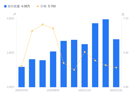 日期A股户数(户)流通A股户均持股数(股)户均持股市值(万元)2025-12-314078023888.5913.622025-11-304778320387.5211.822025-11-204639720996.5512.582025-11-103907624930.3115.812025-10-204058324004.5513.472025-09-304021924221.8114.272025-08-203651326680.2719.482025-08-083344628090.3720.962025-07-313380124418.6317.582025-07-203111926523.1515.25