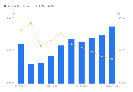日期A股户数(户)流通A股户均持股数(股)户均持股市值(万元)2026-01-092834328511.5740.912025-12-192767429200.8242.202025-12-102745329435.8943.152025-11-282718129730.4544.122025-11-202741629475.6144.152025-11-102690230038.7946.382025-10-312611830940.4846.812025-10-202557531597.4047.082025-10-102548331711.4750.362025-09-302702929897.6446.55