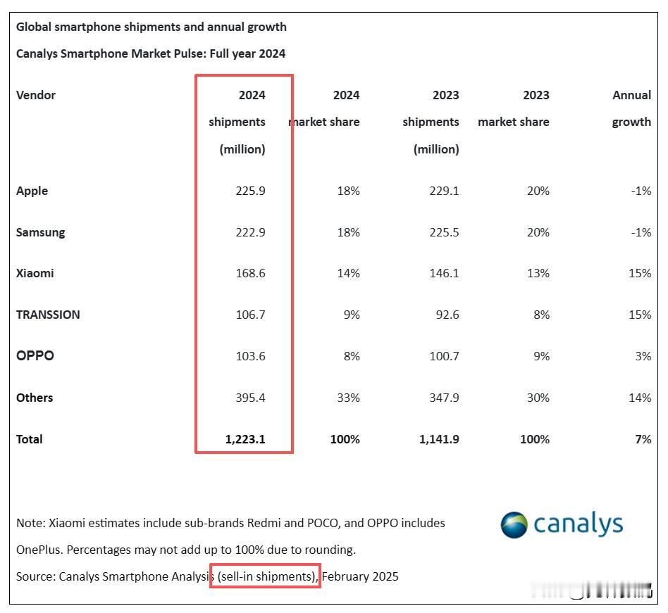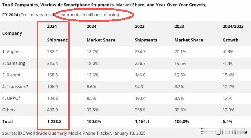 2025全球手机销量出炉,苹果首超三星跃居第一,小米持平第三而华为未进前五! 注意,我这里说的是【销量】,并不是【出货量】,因为三大统计机构的统计方式和叫法不同,所以IDC、counterpoint、canalys三个机构的数据并不一致。IDC、canalys统计的是出货量,而counterpoint则是统计的销量。 并且去年IDC、canalys两家机构按照【出货量】来看的话,苹果其实已经超过三星了,但是counterpoint统计的销量上,三星还是以微弱的优势超过苹果拿下第一。 解释完【销量】,我们直接看counterpoint数据: 第一名:苹果 20%份额 第二名:三星 19%份额 第三名:小米 13%份额 第四名:vivo 8%份额 第五名:OPPO 8%份额 前五名拿下销量的68%,占比近7成,跟往年差不多,但有几个数据值得关注: ①、今年苹果是最大的黑马,同比暴涨10%,以20%的市占率拿下第一,必须强调的是,这是苹果在【销量】上首次超过三星,拿下智能手机市场的第一。不出意外的话,另外两家机构统计的数据上今年也是苹果第一,那么真正实现三家机构的第一,货真价实。 不用说都知道,最大的功臣就是iPhone17标准版,其销量对比iPhone16基本是翻倍了,而整个iPhone17系列在国内的销量已经达到1500万了,实在太恐怖了。 ②、第二名则是三星,三星前几年一直是老大,但是最近几年增长乏力,去年跟苹果的差距就非常小了,今年iPhone17一发力,三星就有点接不住了,但是三星的盘子还是挺稳,至少后面第三的小米差距还非常大。 ③、小米今年还是13%的市占比,但是同比没有增长,也算稳住了。 ④、vivo在国内连续5年拿下第一,但是在全球市场上一直进不了前三,今年也是微弱的优势超过OPPO成为全球第四,并且同比有3%的增长,这比OPPO的4%下滑和小米的持平看起来,还是小有进步。 ⑤、OPPO同比减少了4%,国内也没有占到便宜,所以后面把Realme也收回OPPO旗下(OPPO要是把Realme加上去,全球销量又会超过vivo),就是为了节省开支。最近几年OPPO比较挣扎,改动不小,但是收效甚微。 至于华为,在全球市场并未进入前五,看来想在全球市场取得成绩,还是得发展海外市场。 不管怎么说,2025年的数据基本就这样了,但是2026年就比较有意思了,苹果能否继续拿下第一?而国内市场更是竞争白热化,vivo就比小米超了一点点,后面的苹果、华为也虎视眈眈,2026年到底谁是第一还真不好说。