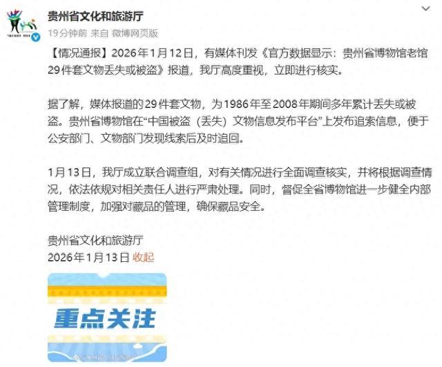 2026年1月12日,有媒体刊发《官方数据显示:贵州省博物馆老馆29件套文物丢失或被盗》报道,我厅高度重视,立即进行核实。