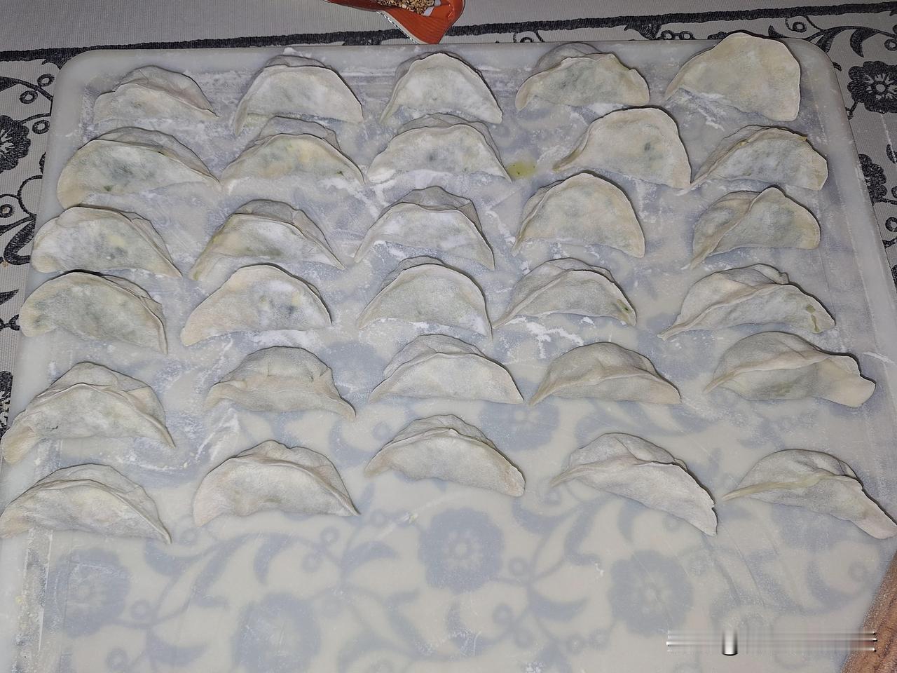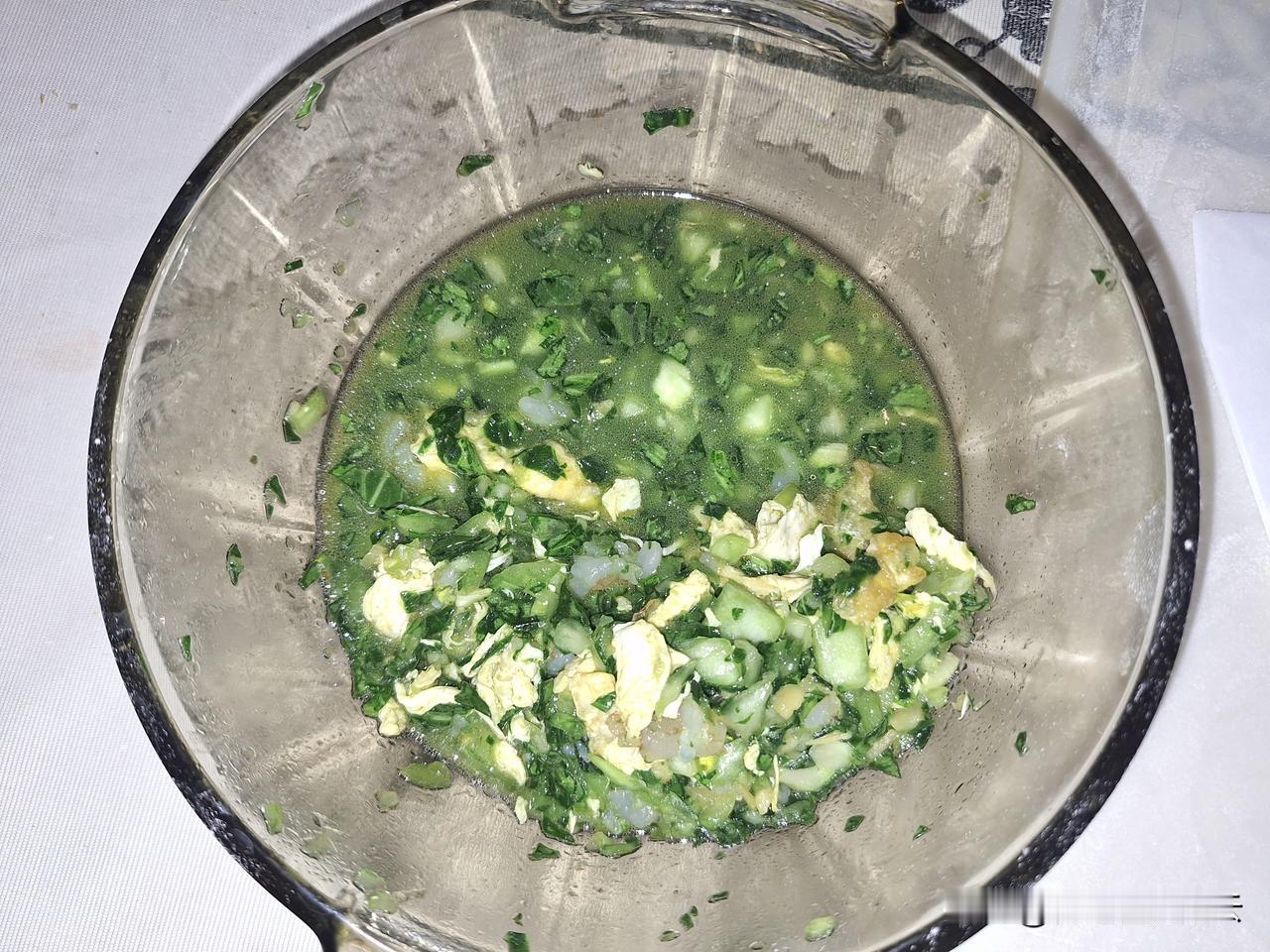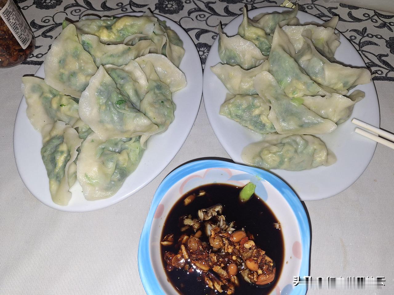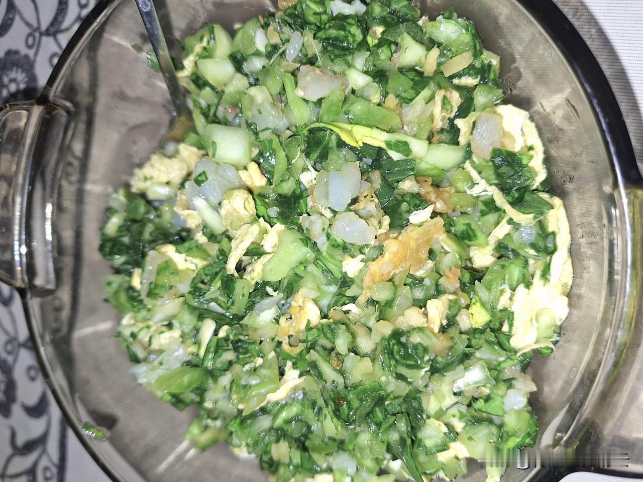 一个半小时,和面、调馅、擀皮、包、煮、吃,30个饺子下肚。 上海青加虾仁加鸡蛋做馅,饺子就是好吃,鲜美可口。 美中不足就是馅又剩下了,原来我是看到剩了馅就再去和面,剩了面就再去调馅,结果发现包饺子要发扬愚公移山精神,后来就“道法自然”,一切都是最好的安排。无论剩面还是馅,剩了就剩了,放冰箱里下次再吃。剩了馅就下一顿煮个面,剩了面就改天做手抓饼吃。