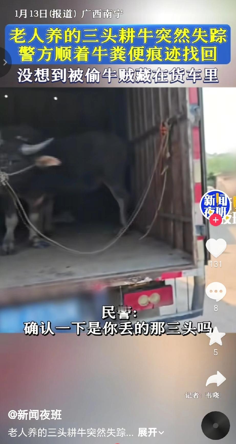 近日广西南宁一位老人养的三头耕牛突然失踪,这些牛是老人自己养了很久的,并非用来售卖牛不见后报警,接到报警后,邕宁公安分局民警迅速到场展开走访调查,顺着牛粪便的痕迹,发现了一辆可疑货车,很快揪出偷牛嫌疑人蓝某佳和司机翟某才。最终,警方在货车里找到了老人丢失的三头耕牛(一头公牛、两头母牛),并将其发还给老人。(来源于@新闻夜班)