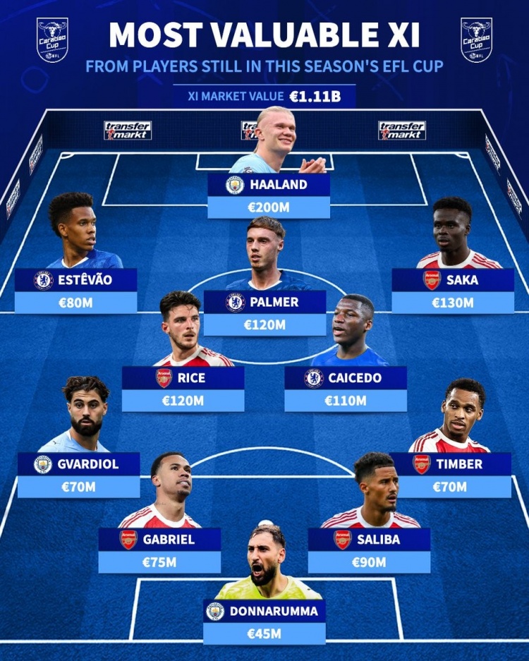 直播吧1月13日讯足总杯第3轮已经完赛,《转会市场》也列出了仍未出局的球员最贵阵,阿森纳5将在列、切尔西曼城各3人。