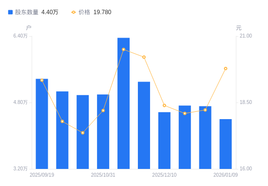日期A股户数(户)流通A股户均持股数(股)户均持股市值(万元)2026-01-09439905363.3310.612025-12-31471195007.179.122025-12-19472634991.919.032025-12-10456655166.609.502025-11-28529884452.579.002025-11-20635843710.577.612025-10-31499394724.428.602025-10-20497854739.038.232025-09-30506724656.088.282025-09-19537204391.908.49
