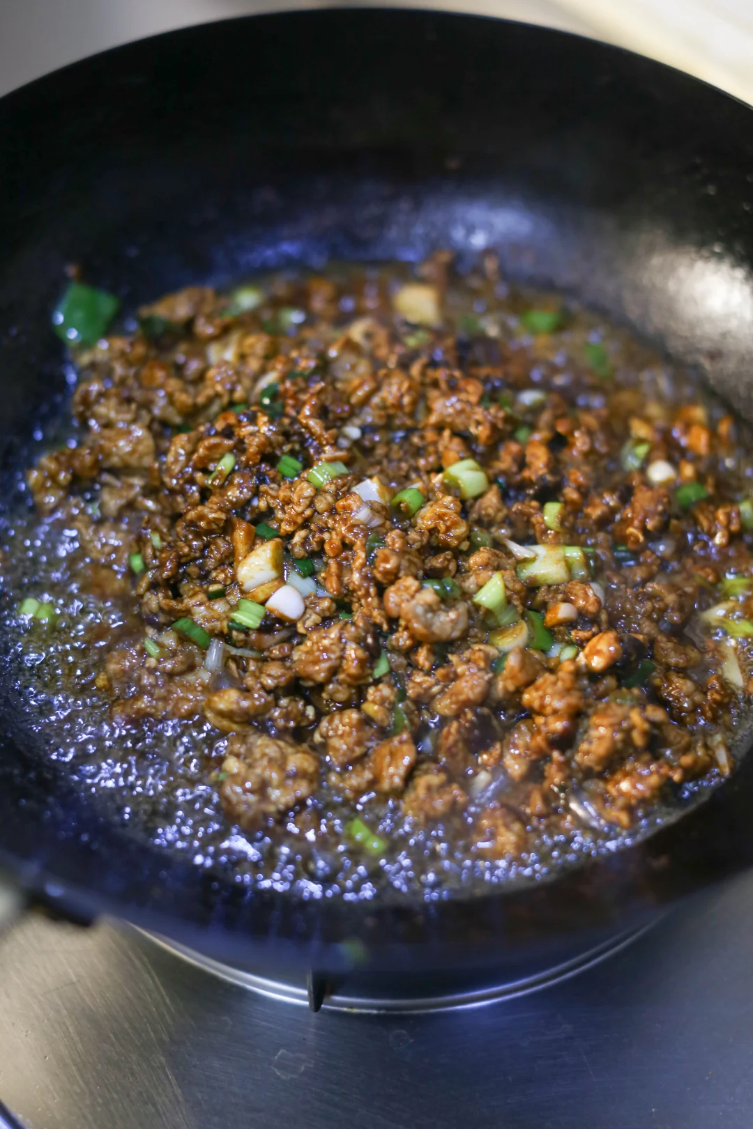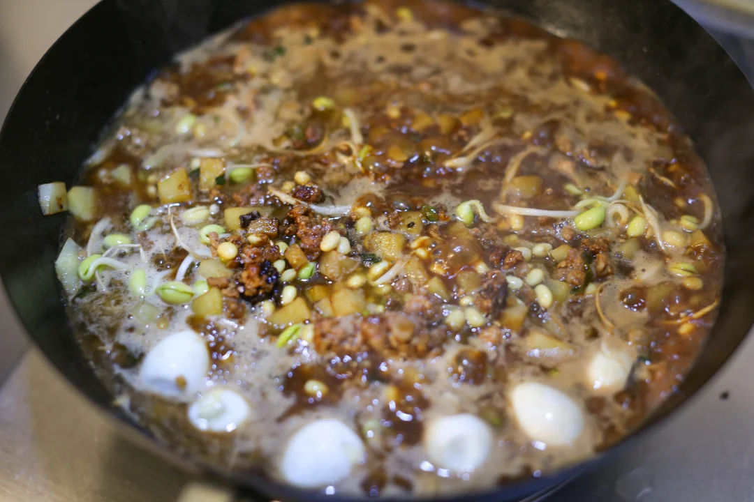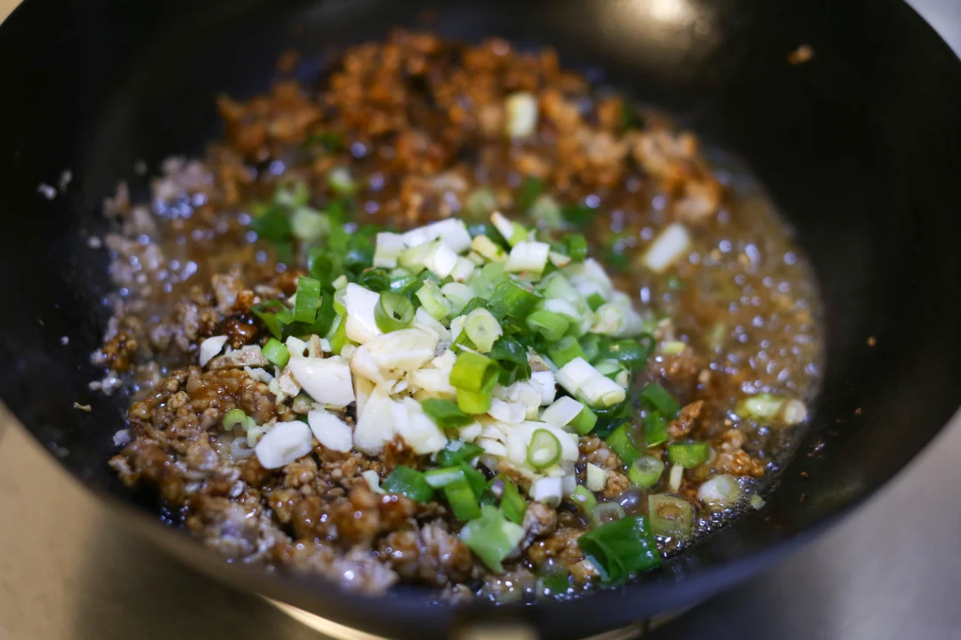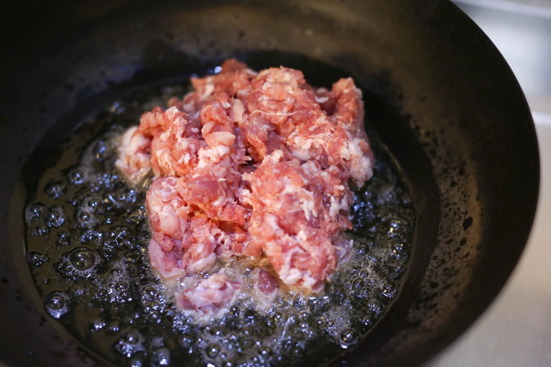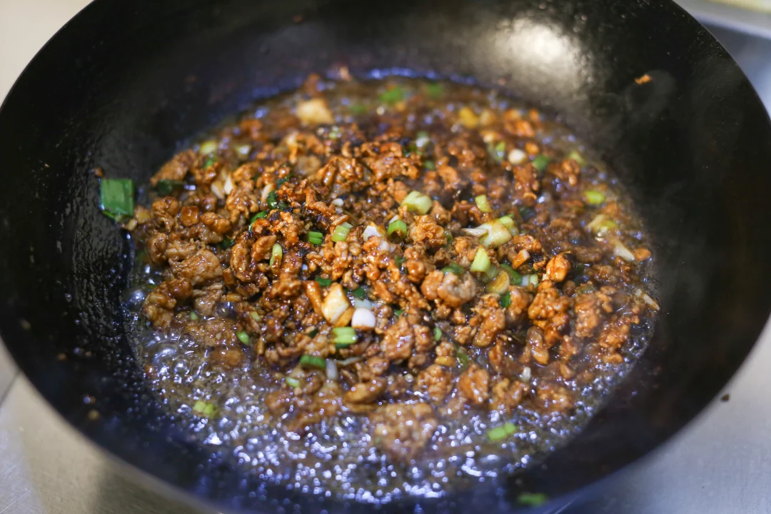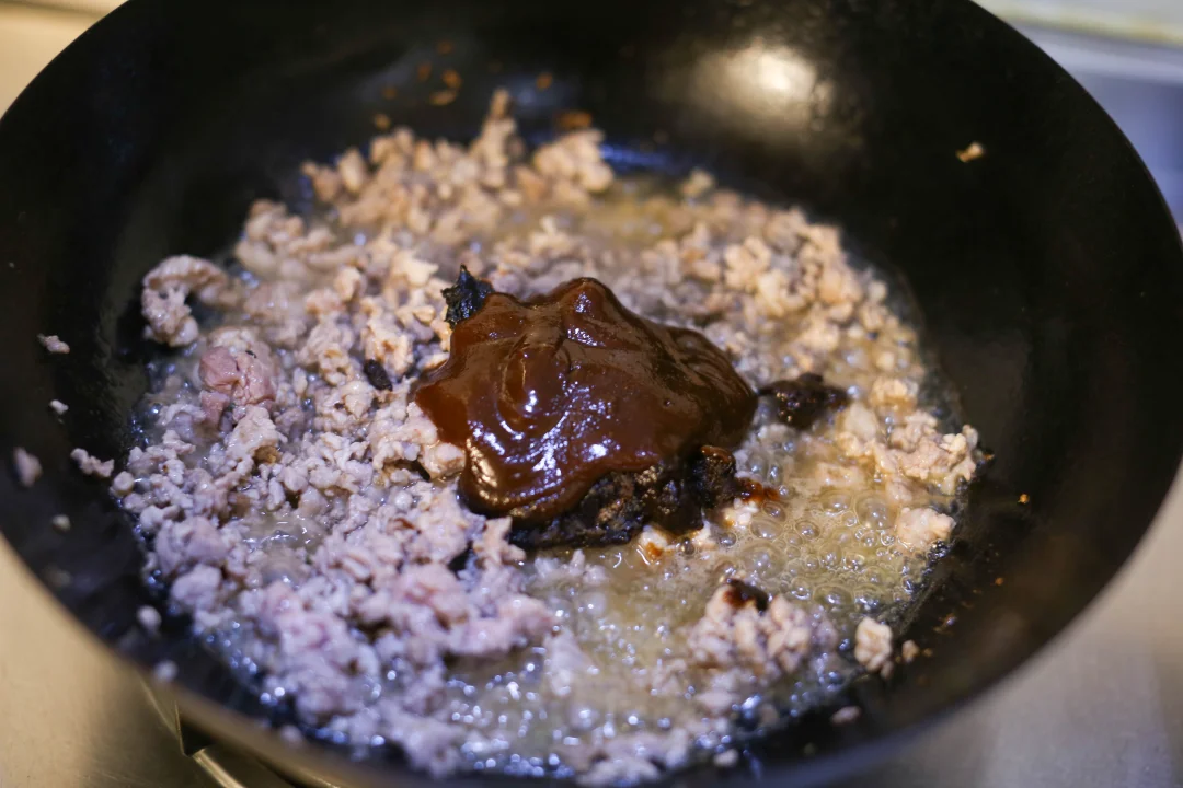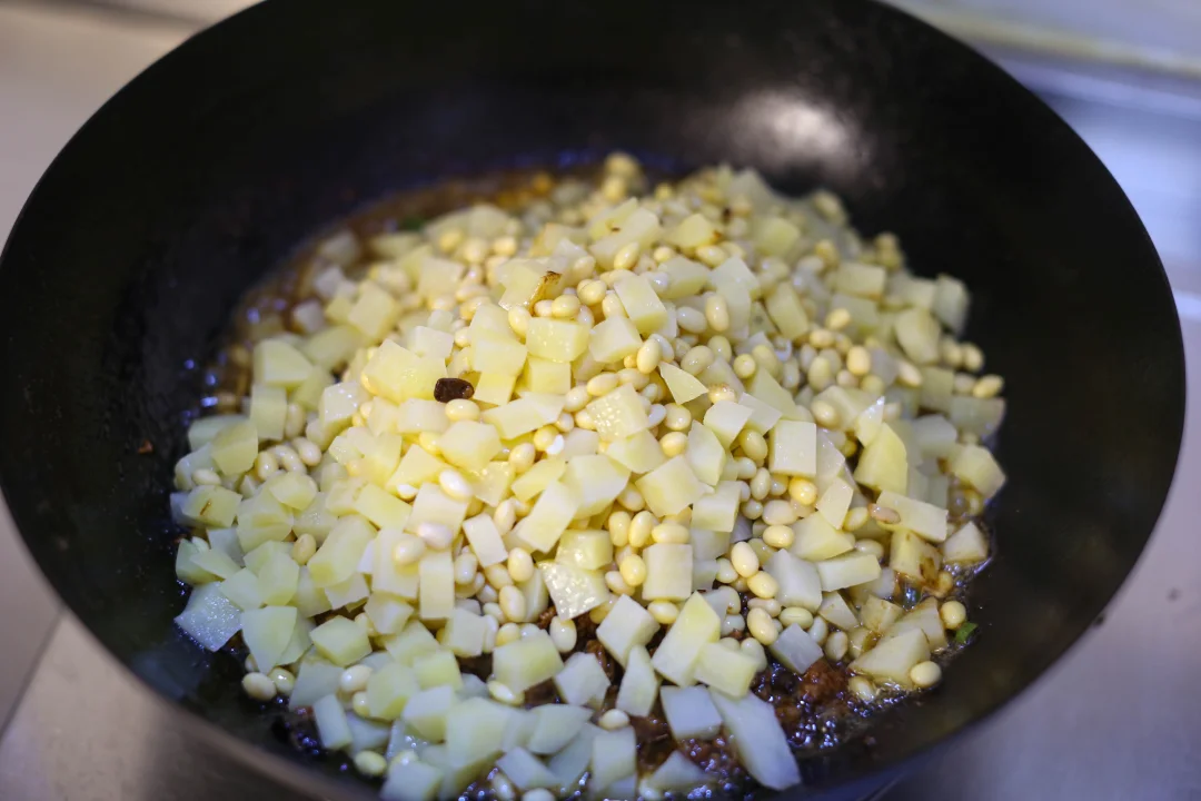 热锅凉油,可以适量多点,加入肉末炒香变色,把肉末里面的油脂充分炒出来之后加入甜面酱、豆瓣酱、干黄酱,炒出酱香味,加入葱姜蒜继续翻炒,加入汆烫过的土豆丁和黄豆。