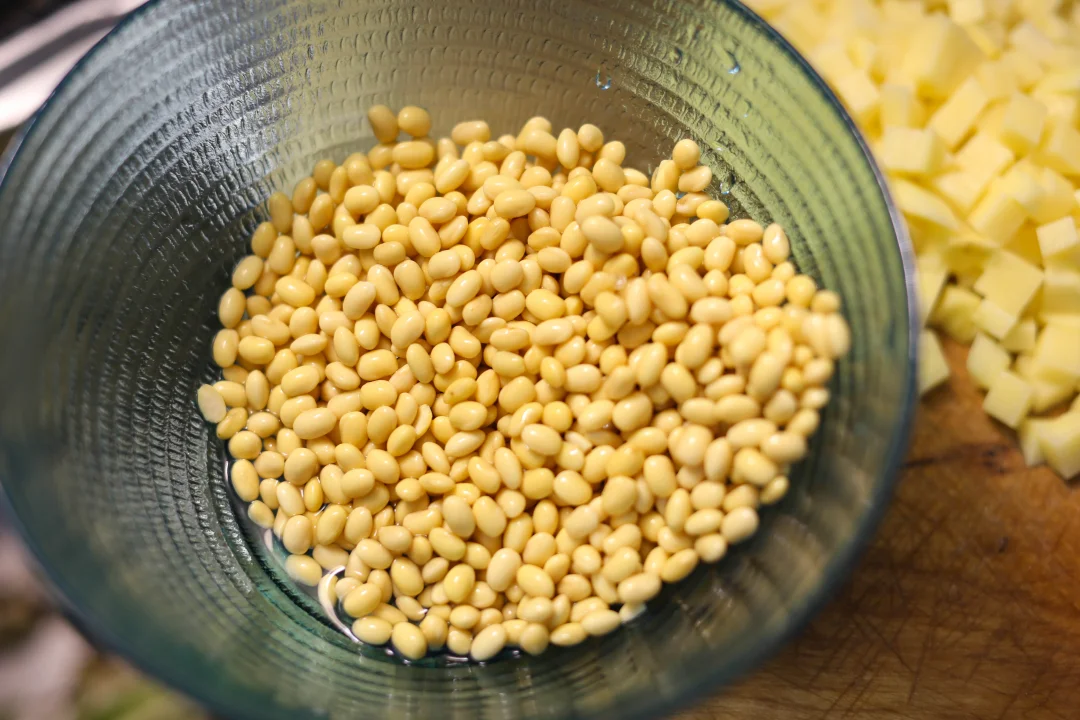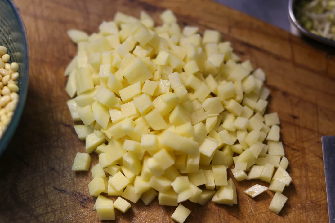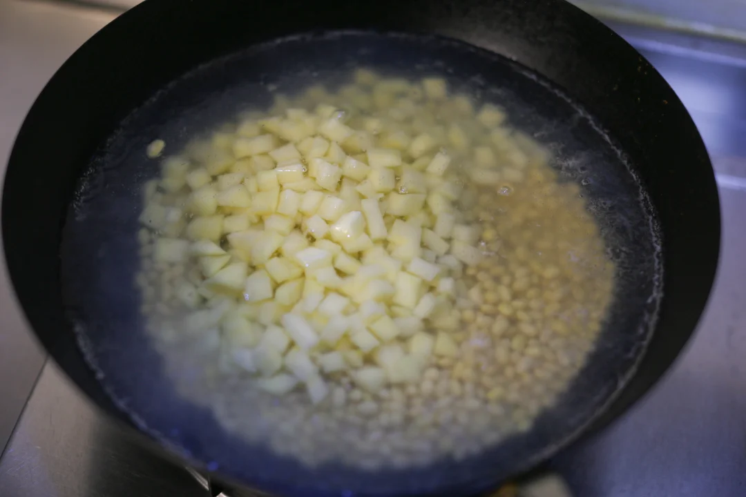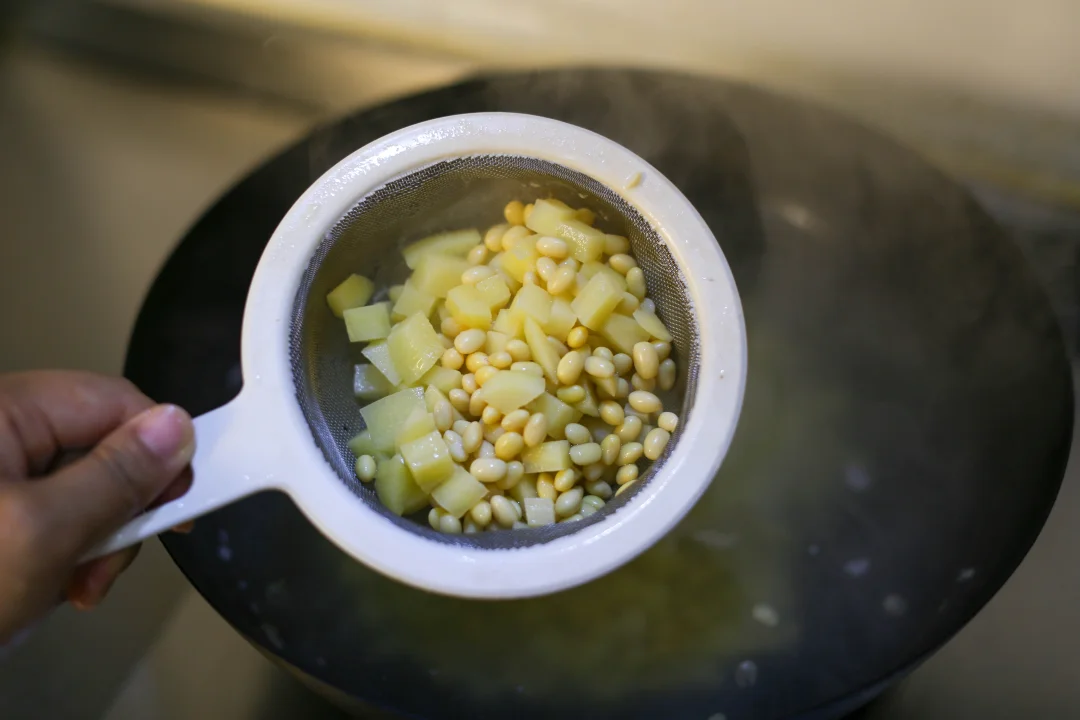 黄豆提前泡发,土豆切丁。