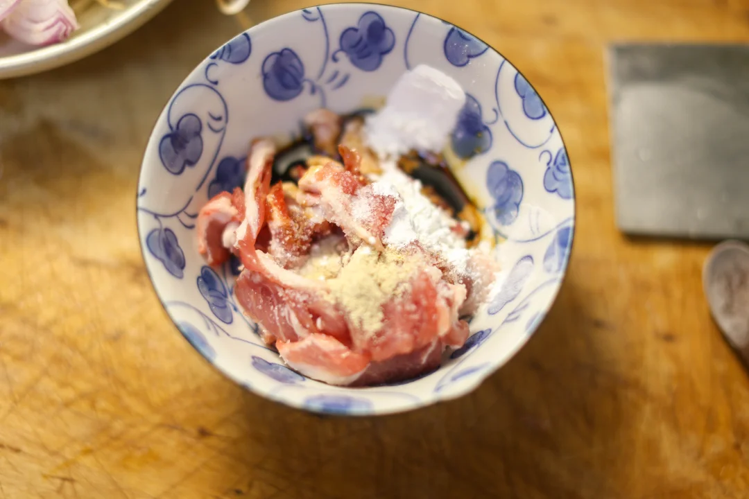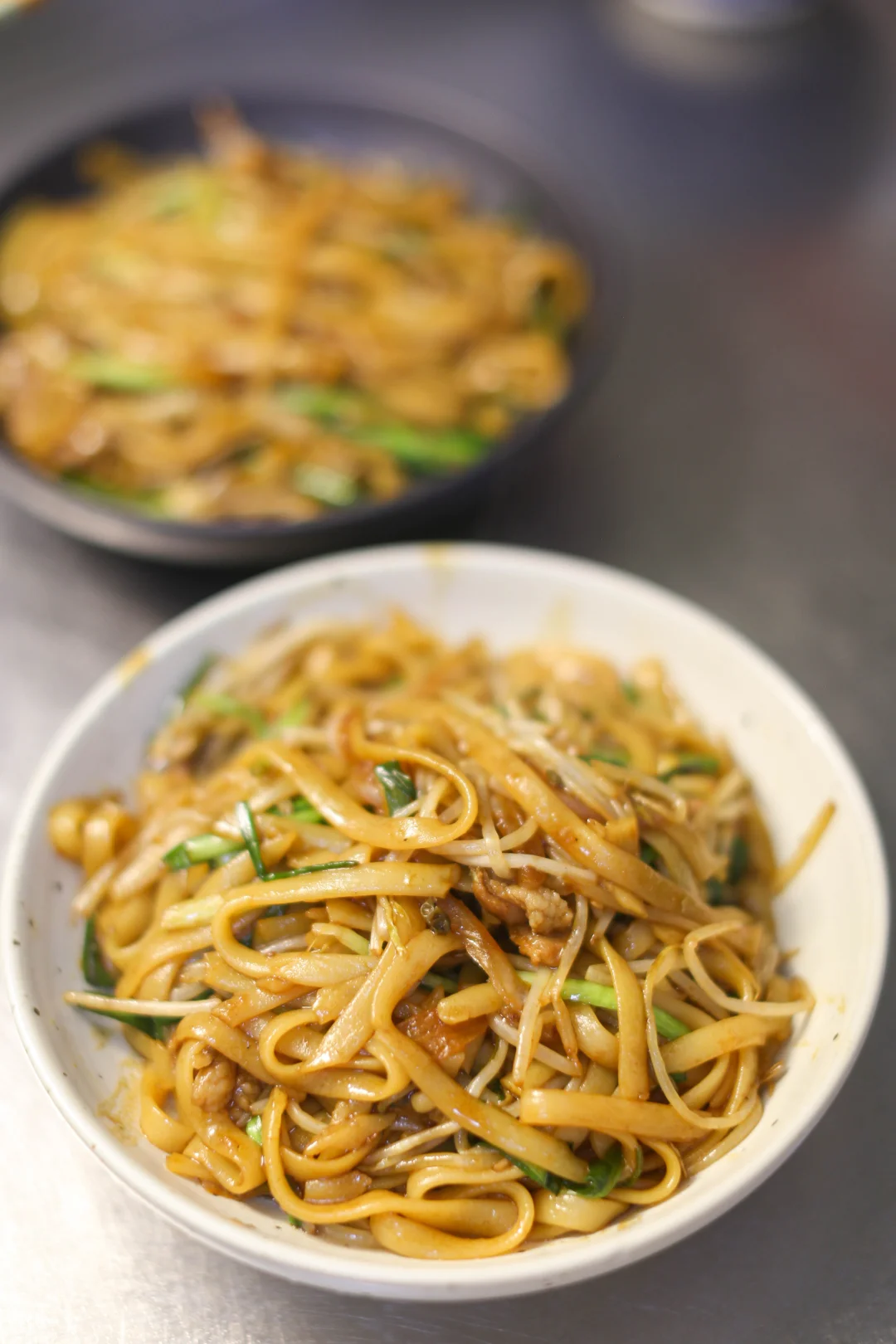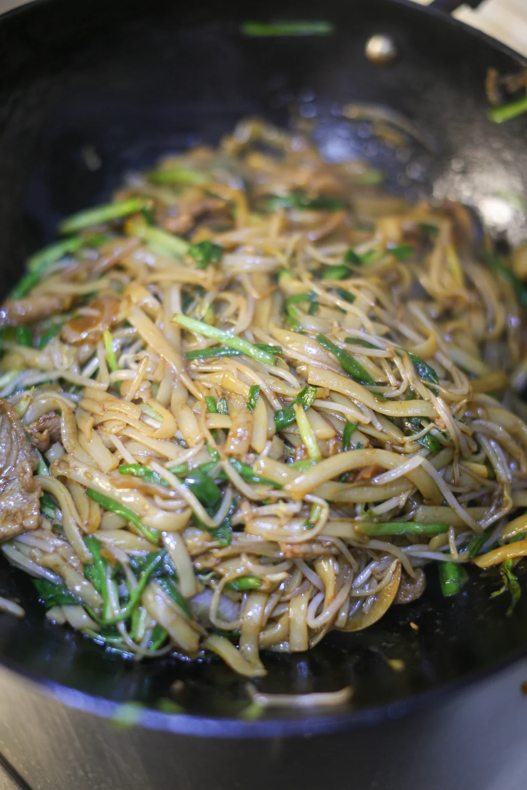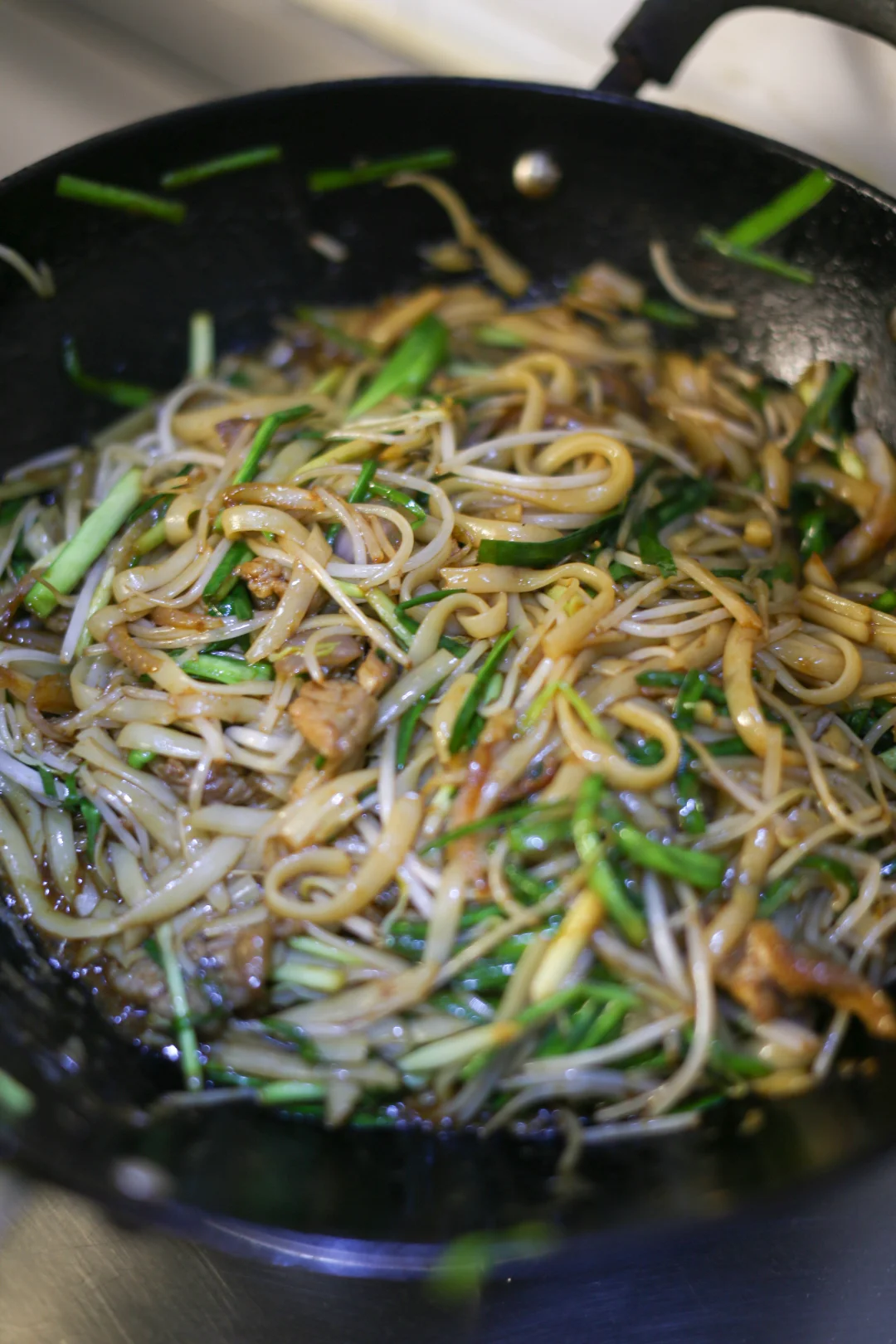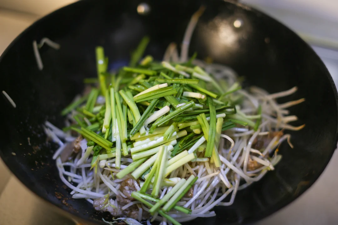 米粉可以随意选择,可宽可细,根据喜好。 蔬菜只有绿豆芽和韭菜段。 肉丝提前腌制一下,滑炒盛出备用。 锅里加入底油,加入绿豆芽,滑炒好的肉丝,韭菜段,放入提前泡好的宽粉,加入生抽,老抽、蚝油、盐,白糖,翻炒即可。