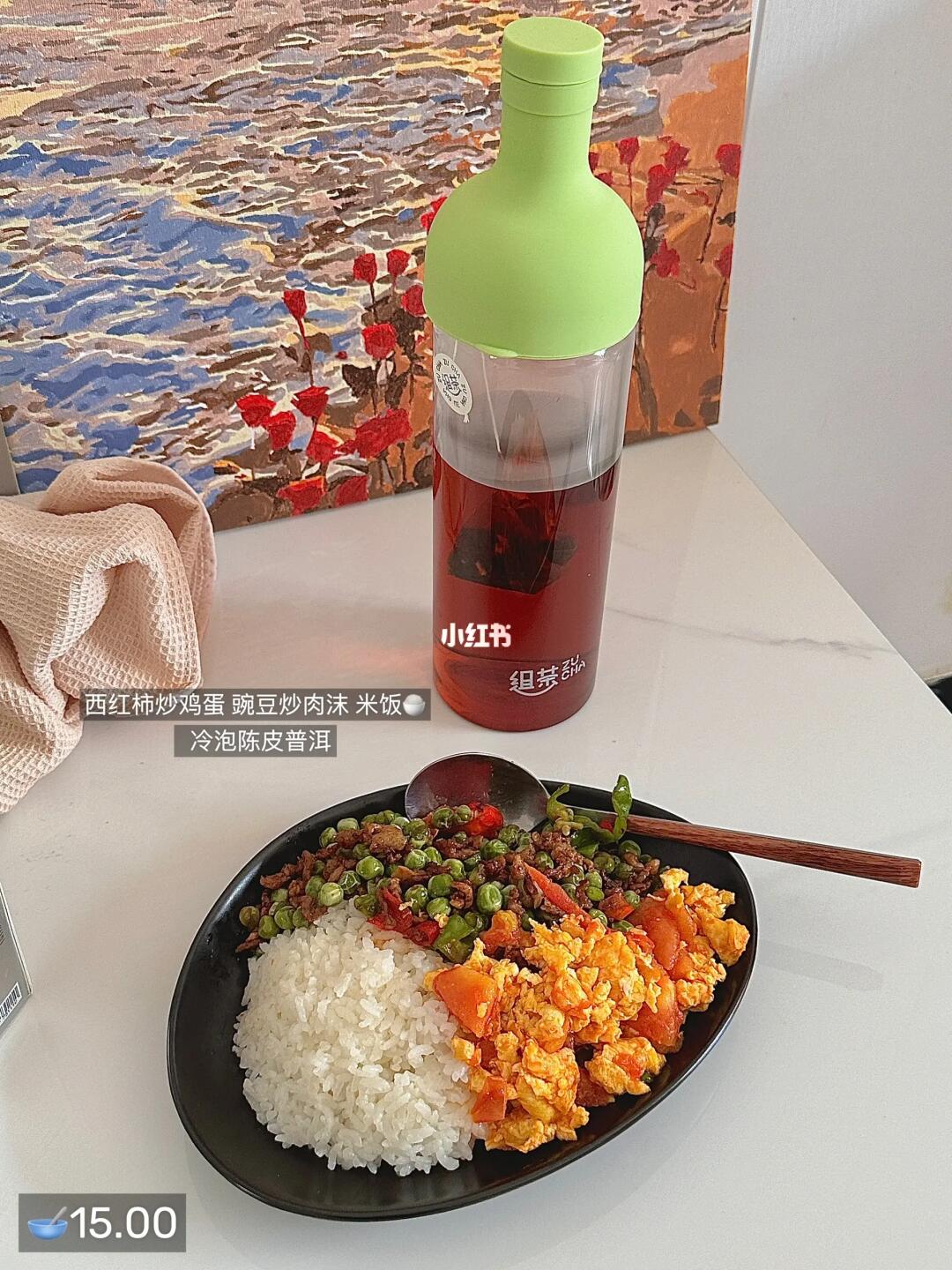 初始体重:60kg - 🥣早午餐:蓝莓贝果➕煎蛋➕奶酪➕猕猴桃🥝➕黑咖啡 🥣晚餐:西红柿炒鸡蛋➕米饭➕豌豆炒肉沫➕冷泡陈皮普洱茶 🥣加:橙c 运动🈚 喝水2500ml - 每天不喝冰实在忍不住 吃米饭配冷泡茶今天喝陈皮普洱🍵 茶汤清澈 口感纯 夏天不爱喝水的就喝冷泡茶 清爽解渴