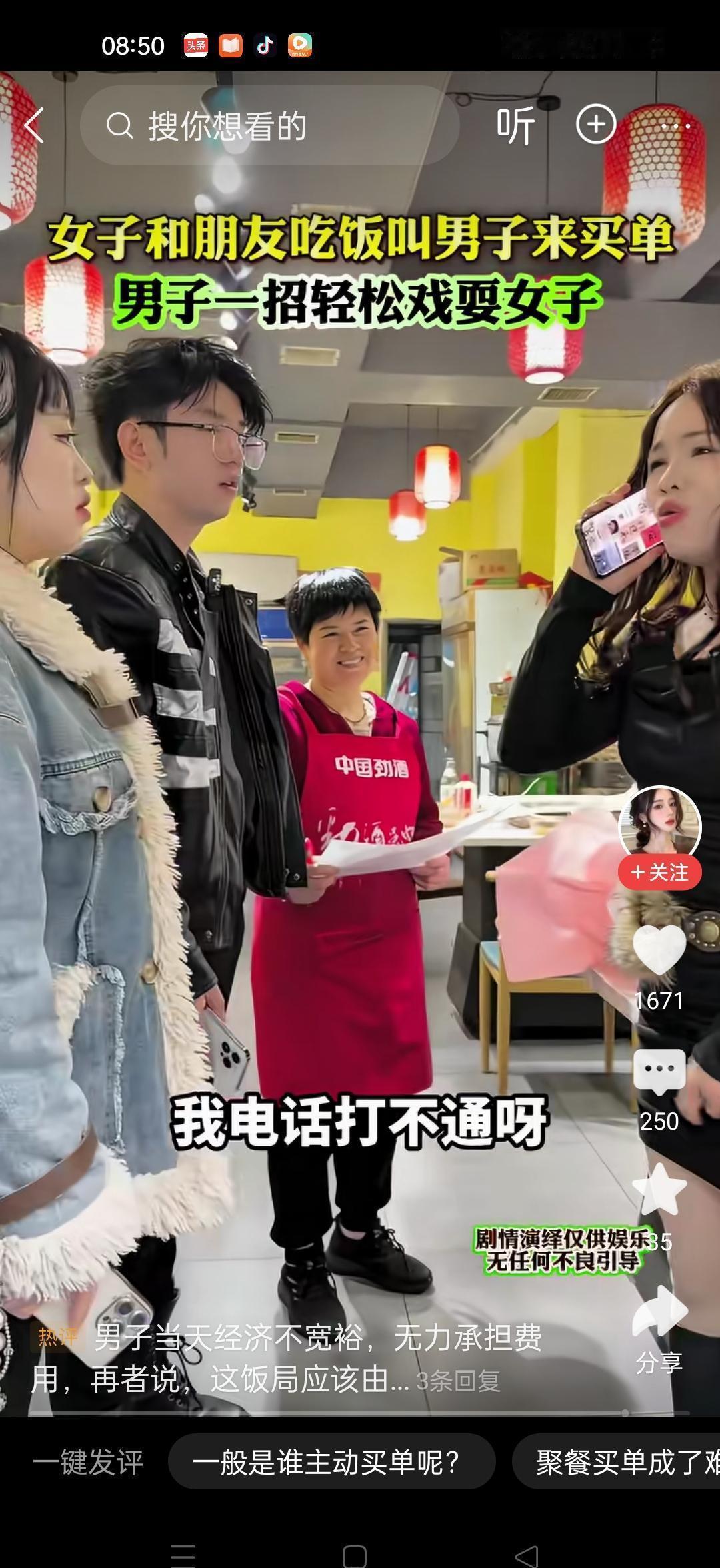 这剧情也太尴尬了吧……请了好几个人吃饭,快吃完她打电话叫男友过来。男友一来看着人群就懵了,她当场喊“辉哥,你来帮我们买单吧”。他还说“多点点,我去车上拿钱”,结果人走不回,电话一直不通,最后直接把她拉黑了。感觉被当替身了似的。朋友也愣着,不知道怎么收场。要是真这样,心凉了……你们觉得呢?