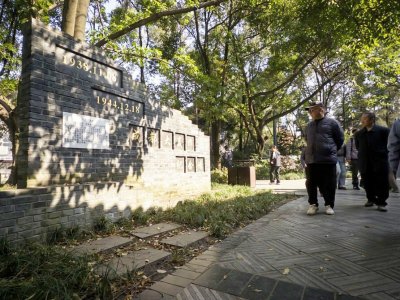 在成都市人民公园,市民驻足观看“成都大轰炸”纪念碑。图据新华社客户端