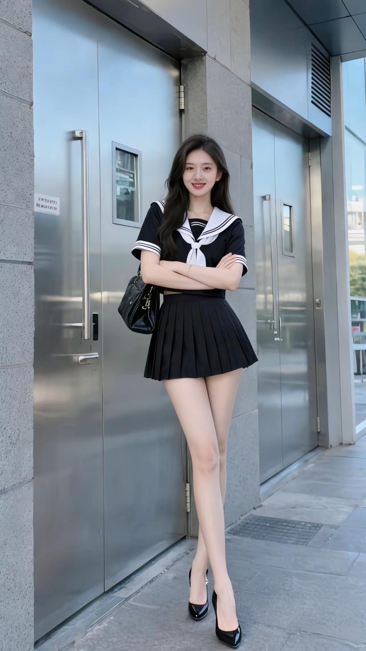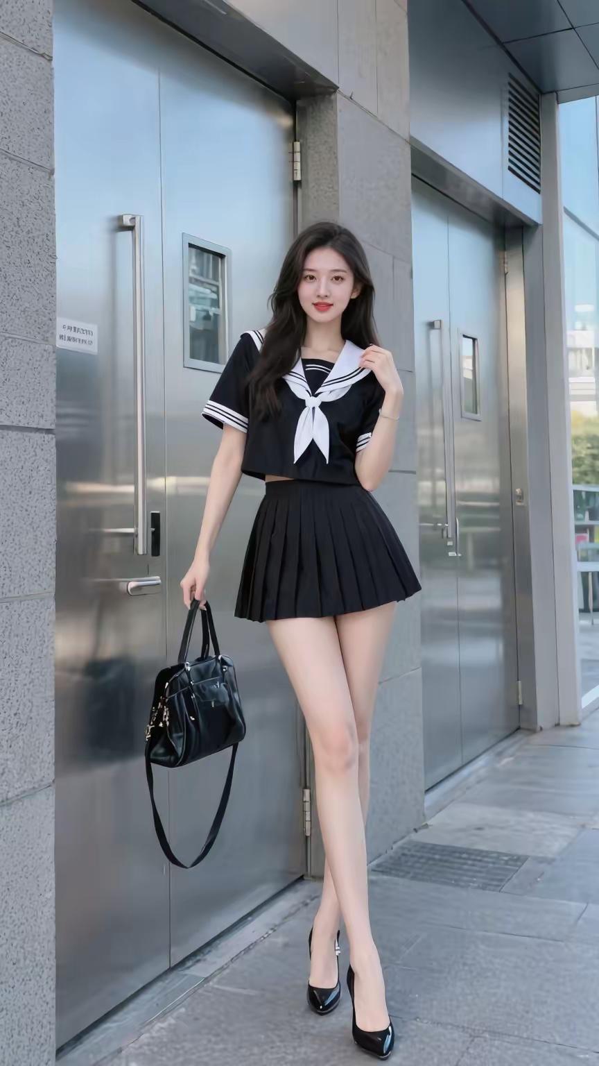 甜美校园风穿搭,黑白水手服搭配黑色小包,元气满满!💕美女的美丽体现在何处呢?