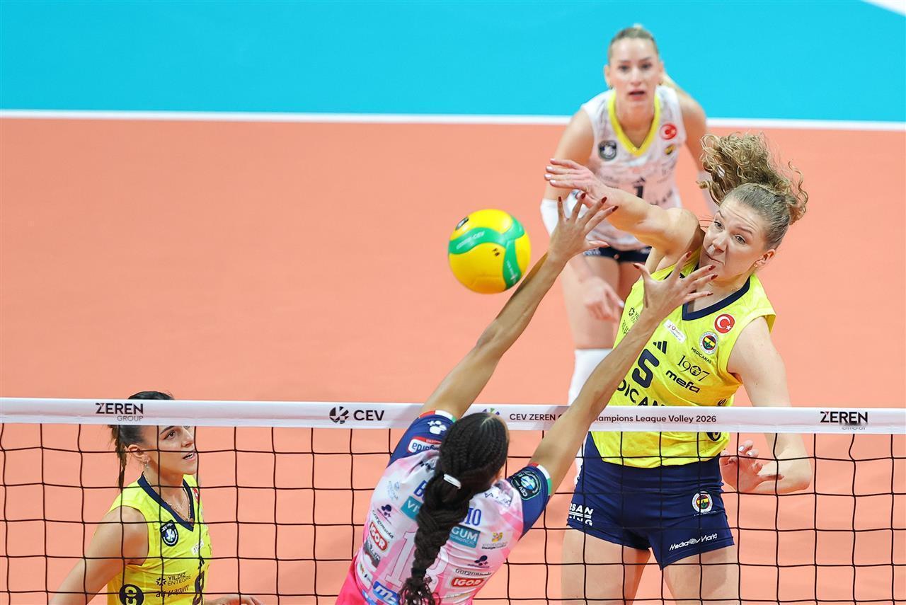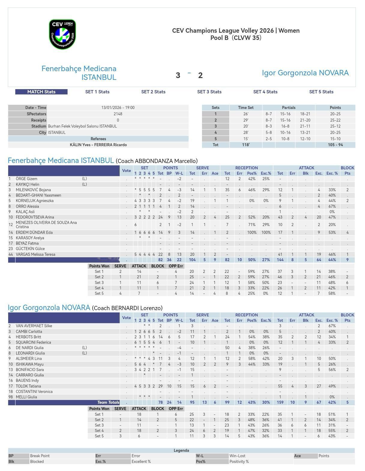 小彩娃决胜局三连发,费内双杀诺瓦拉 2025-2026女排欧冠小组赛第四轮,费内巴切主场3-2战胜诺瓦拉,比分20-25, 25-22, 25-12, 20-25, 15-10,继第二轮客场3-0横扫诺瓦拉后,今天实现欧冠小组赛对诺瓦拉双杀。小彩娃不但获得全队最高的24分,决胜局在诺瓦拉开局4-1领先的情况下,在局末胶着阶段连续3个ACE直接获得赛点,为费内获胜立下大功,也当之无愧成为本场比赛的MVP。 费内巴切: 费多罗夫塞娃43扣20中2失4被拦、4拦0发24分 瓦尔加斯41扣19中1失1被拦、1拦2发22分 埃达17扣9中1失0被拦、4拦1发14分 科尔内卢克9扣4中1失0被拦、2拦1发7分 米伦科娃12扣4中1失0被拦、2拦1发7分 奥罗6扣4中0失0被拦、0拦0发4分 贝达特-加尼5扣2中0失0被拦、0拦0发2分 诺瓦拉: 托洛克55扣27中4失3被拦、0拦2发29分 赫伯茨35扣12中2失2被拦、1拦1发14分 阿尔斯迈尔20扣10中3失1被拦、0拦1发11分 博尼法西奥9扣5中0失0被拦、2拦0发5分 石川真佑19扣5中0失1被拦、0拦2发5分 斯夸尔齐尼12扣4中1失1被拦、2拦0发6分 范阿维马特3扣2中0失0被拦、0拦0发2分 坎比5扣2中0失0被拦、0拦0发2分 梅利1扣0中0失1被拦、0拦0发0分 费内巴切-诺瓦拉: 进攻得分:64-67 拦网得分:9-5 发球得分:9-6 对方送分:23-16 总得分:105-94 一传到位率:50%-43% 一传完美率:27%-30% 女排欧冠
