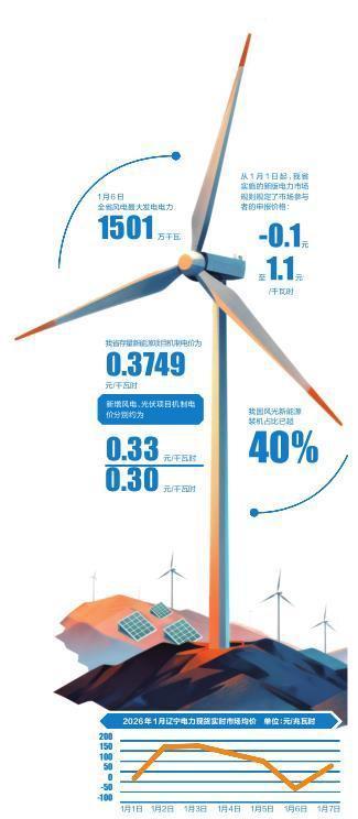 新年伊始,辽宁电力市场记录一组极具标志性的数据:1月6日,全省风电最大发电电力创历史新高,达1501万千瓦。然而,在绿色动能澎湃的同时,一个新现象相伴而生——当日电力现货市场的全天平均出清价格,首次降至零元以下,出现了“负电价”。