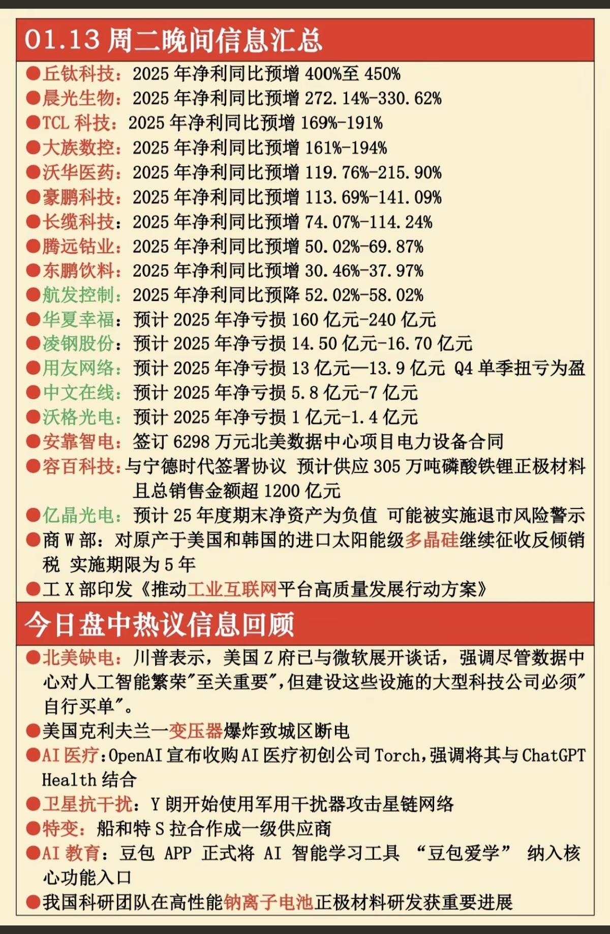 1.14周三 财经信息汇总! 年报业绩预告(亏损,增长) 多晶硅反倾销, 网络安全维护,北美缺电, AI医疗,AI教育,卫信抗干扰