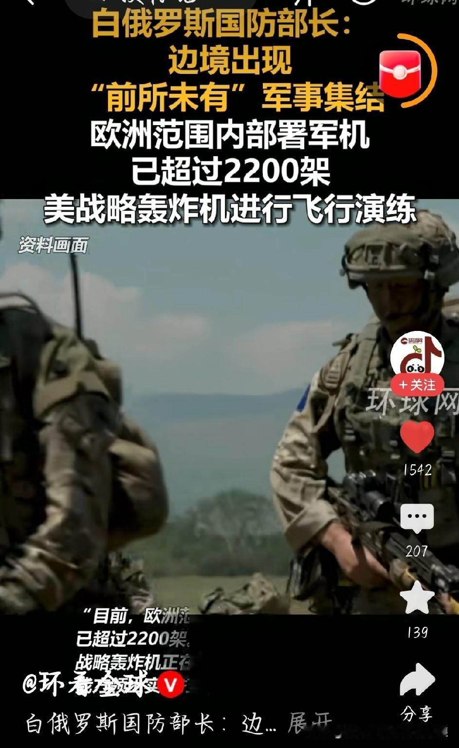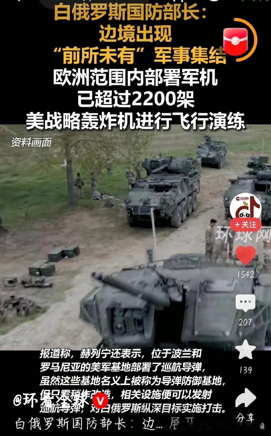 突发!白俄边境军事集结创纪录,欧洲局势紧绷! 2026开年就搞大事!白俄罗斯防长1月12日重磅爆料,边境出现了前所未有的军事集结,欧洲安全警报拉满! 现在欧洲境内已经部署超2200架军机,美军战略轰炸机还在搞演练,模拟打击白俄领土。更让人揪心的是,波兰、罗马尼亚的美军基地藏着巡航导弹,稍改一下就能打纵深目标。 之前白俄边境就老有摩擦,现在这架势直接把紧张感拉到顶点。白俄已经盯紧边境动向,制定了应对方案,还和俄罗斯联手设防。 一边是步步紧逼的军事部署,一边是严阵以待的防御,就怕擦枪走火!你觉得这局势会降温吗?白俄罗斯 白俄罗斯局势 白俄边境出现前所未有军事集结 白俄罗斯集结 白俄罗斯战备
