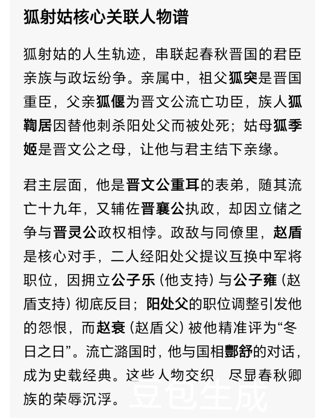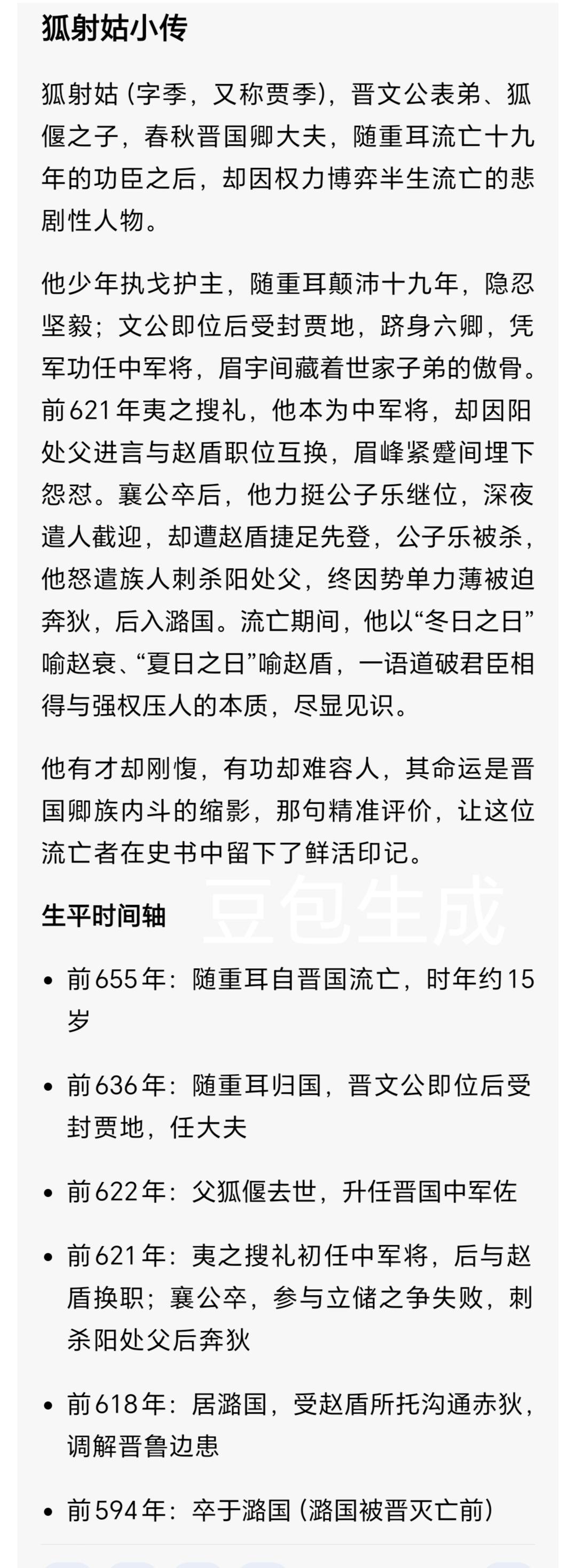 权臣之子流亡史:狐射姑(yè)在晋国政坛的沉浮人生 公元前621年秋,晋国都城绛(jiàng)城的空气里,弥漫着权力交锋的紧张气息。晋襄公刚薨(hōng)逝,国君人选的争夺,将权臣狐射姑(yè)推向了命运的悬崖。一场廷议的分歧,让这位显赫世家的子弟,最终只能在夜色里收拾行囊,踏上流亡狄国的道路。 一、显赫家族的继承人 狐射姑(yè)出身晋国顶级世家狐氏。他的父亲狐偃,是晋文公重耳的舅舅,更是重耳流亡十九年的核心谋臣。城濮(pú)之战中,狐偃献策大败楚军,助力晋文公成就春秋霸主之业,被晋文公尊称为“吾父”。 生长在晋文公称霸的鼎盛时期,狐射姑(yè)自幼浸润在权谋与国事之中。凭借家族功勋与自身才干,他早早跻身晋国政治核心圈,在晋襄公在位时,一度官至中军帅,手握军政实权。 二、立君之争:一场改变命运的廷议 公元前621年八月,晋襄公病重,召见狐射姑(yè)与赵盾托付后事,原本属意年幼的太子夷皋(gāo)继位。可襄公离世后,朝堂立刻分裂为两派,围绕新君人选展开激烈博弈。 赵盾主张拥立公子雍。公子雍是晋文公之子,在秦国为质多年,年长贤明,若迎他回国,既能稳定晋国政局,又能修复秦晋两国关系。 狐射姑(yè)则坚持拥立公子乐。公子乐的母亲是辰嬴(yíng),曾得到晋怀公、晋文公两代国君的宠爱,狐射姑(yè)认为,立公子乐能获得更多贵族支持。 这场争论的本质,是狐氏与赵氏两大权臣家族的权力角逐。赵盾当场反驳,直言辰嬴(yíng)身份卑微,公子乐也毫无功绩,远不如公子雍贤德。最终,赵盾凭借更强的朝堂掌控力,敲定了迎立公子雍的决议,还派先蔑(miè)、士会远赴秦国接洽。 三、政变骤起:从权臣到流亡者 局势的反转来得猝不及防。太子夷皋(gāo)的母亲穆嬴(yíng),抱着幼童每日到朝堂哭闹,质问大臣们为何舍弃嫡子,又跑到赵盾家中跪地哀求。 赵盾担心内乱爆发,竟突然改变立场,背弃与秦国的约定,改立夷皋(gāo)为新君,即晋灵公。为了阻止公子雍回国,赵盾甚至派兵突袭秦国护送队伍,这场战役史称令狐(líng hú)之战。 狐射姑(yè)就此彻底失势。赵盾先是派人在陈国刺杀了公子乐,斩断了狐射姑(yè)的政治根基。而真正的导火索,是阳处父事件。 阳处父是晋国大夫,曾以晋襄公的名义,将中军帅的人选从狐射姑(yè)换成赵盾,此事一直让狐射姑(yè)心怀怨恨。如今政治失利,恼羞成怒的狐射姑(yè)派亲信刺杀了阳处父。 赵盾抓住这个把柄,立刻下令追责。狐射姑(yè)深知自己在晋国已无立足之地,想起家族与狄国的血缘渊源——狐偃的母亲本就是狄人,狄国也成了他唯一的避难所。 秋夜沉沉,狐射姑(yè)收拾好简单的行囊,孤身一人逃离绛(jiàng)城。他或许会想起父亲狐偃追随晋文公流亡的过往,只是这一次,他没有君主相伴,只有无尽的落寞与仓皇。 四、狄国岁月:狐氏家族的落幕 流亡狄国后,狐射姑(yè)的身影便很少出现在史料记载中。这位曾经的晋国权臣,终究成了寄人篱下的流亡者。他只能隔着遥远的距离,听闻故国的消息:赵盾独揽晋国大权,晋灵公年幼形同傀儡,卿大夫家族的权力倾轧愈演愈烈。 狐射姑(yè)再也没能回到晋国,最终大概率终老于狄国。随着他的流亡,显赫一时的狐氏家族彻底衰落,逐渐退出了晋国的政治核心舞台。 五、历史回响中的狐射姑(yè) 狐射姑(yè)的沉浮,是春秋中期晋国政治的缩影。彼时,卿大夫家族势力崛起,国君权力日渐衰微,各大世家为争夺主导权,展开了一轮又一轮的激烈厮杀。 狐射姑(yè)并非庸碌之辈,他能身居高位,自有其政治才干。但在与赵盾的交锋中,他既缺乏临机决断的魄力,又因刺杀阳处父授人以柄,最终落得流亡的下场。 翻开《左传》,在“文公六年”的寥寥数笔里,我们仍能窥见那个在朝堂上据理力争的身影。狐射姑(yè)的名字,连同狐氏家族的兴衰,都被刻进了晋国从公室掌权走向六卿执政的历史轨迹里。 历史向来由胜利者书写,但失败者的命运抉择,同样值得后人深思。