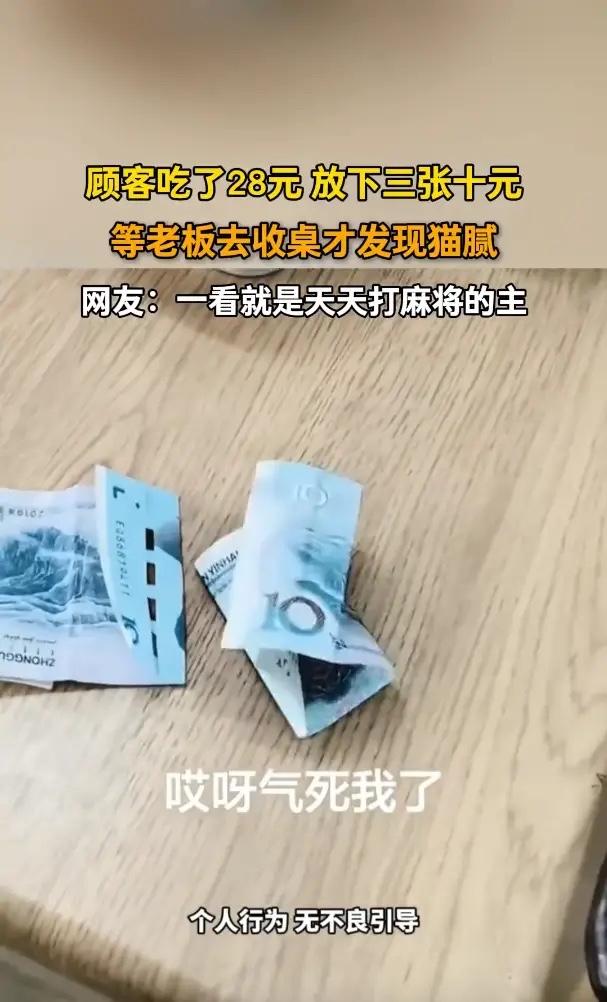 “活不起了!”近日,四名女子去餐馆吃饭花了28元,吃完后,放了30元在桌子上就直接离开,老板开始看见还挺开心,以为是女子见他长得帅,没想到把钱拿起来一看,才发现对方是把一张10块叠成了两张模样,实际只给了20!有网友调侃:一看就天天打麻将! 老板捏着那叠钱感觉不对劲,抽出来细看,才发现其中一张十元钞票是从中间整齐叠成双层的“半张钱”,粗看根本分辨不出来。这种手法让老板愣了好几秒,才反应过来她们实际只付了20元,还欠着8块。 这几位女顾客没喊老板结账,直接把钱压在桌上就走了。老板收拾桌子时看到三张十元钞票叠在那儿,起初还以为是常客照顾生意,甚至开玩笑说“该不会是看我长得帅吧”。 小本生意利润微薄,一碗一碟赚得都不容易。这种刻意欺骗的感觉最让人难受。如果真遇到困难,直说一声抹个零,很多店主都能体谅。这种为了8元钱费尽心思的行为,真是太难为她们了。 诚信不仅是人际交往的准则,也是社会运转的保障,社会上大量存在不讲真话、不守信用、没有信誉、弄虚作假等现象,这被称为“诚信缺失症”。 这几位女子可能没意识到,这种看似聪明的小伎俩,其实活得很累。每天要算计,要掩饰,生怕被拆穿。而这8元钱,永远买不回心里那份踏实。 开门做生意讲的是诚意,做人过日子凭的也是诚意。哪怕日子再难,不欺心、不欺人,晚上睡觉才能安稳。那份踏实,可比8块钱重多了。 各位读者你们怎么看?欢迎在评论区讨论。