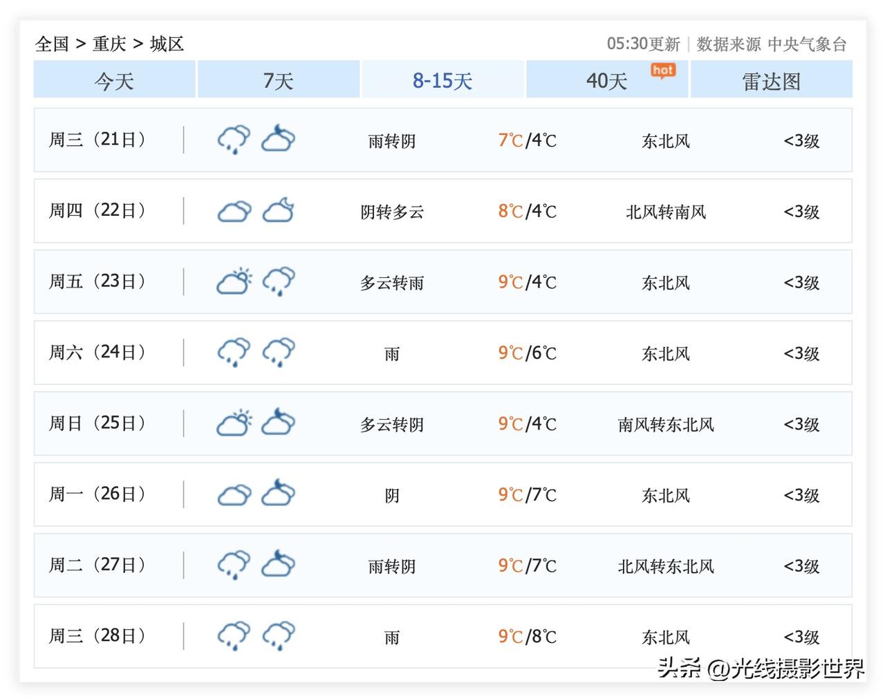 呜呼!超强冷空气已经在准备发货啦!重庆暖冬即将结束!1月19日,重庆开始新一轮降雨降温!所以,1月15日到18日的重庆出大太阳的暖冬,大家抓紧时间,洗洗晒晒!哎!1月21日,重庆主城区,气温暴跌……高山飘雪下雪啊! 1月21日,重庆下雨气温跌至4-7度。 ……想要去仙女山、金佛山、南天湖、武陵山……看雪玩雪的重庆人,可以开始计划啦! 哎!1·月21日到28日,重庆主城区,最高气温不会超过10度! 啊啊啊!三九寒冬,即将在四九彻底冻死重庆人啊!呜呜呜! 四九,真的会这么冷吗?