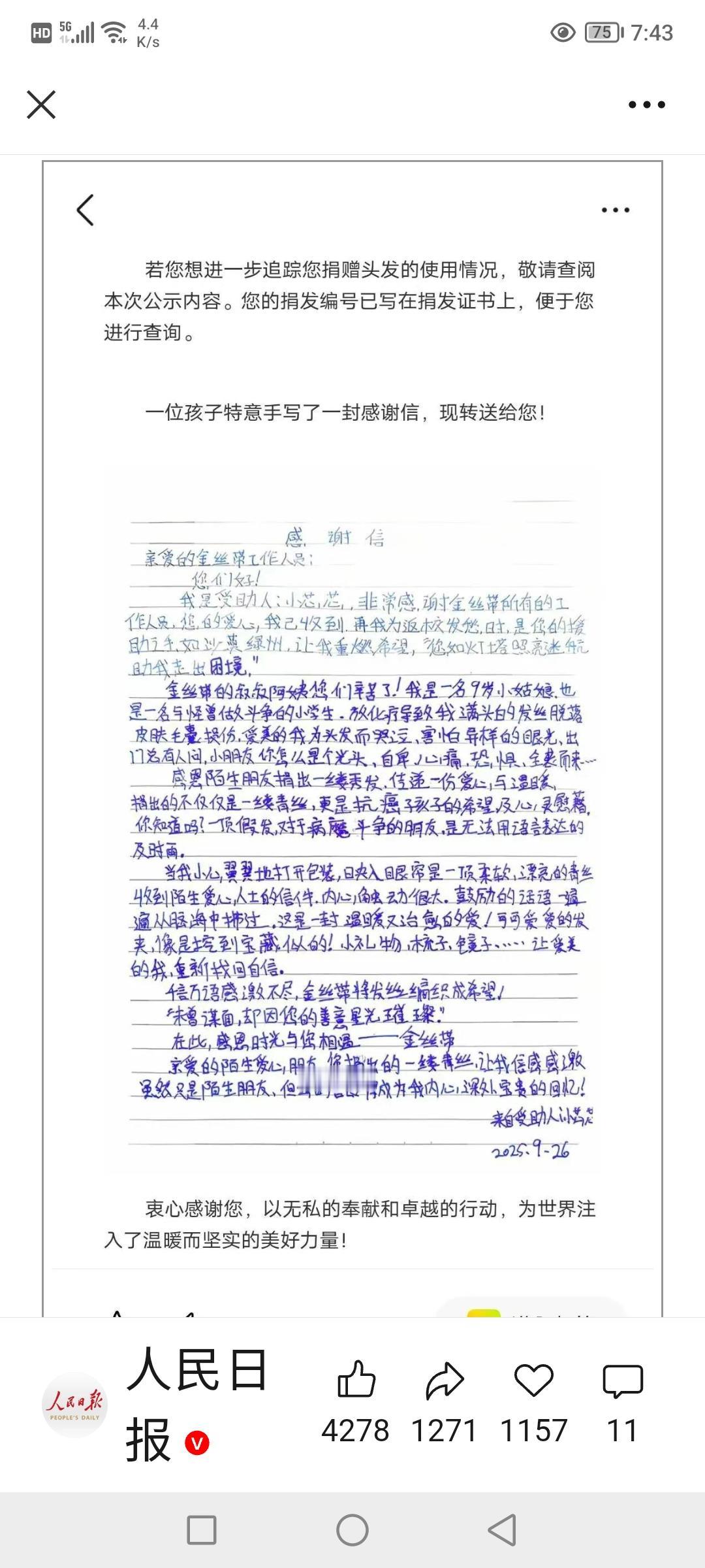 【37厘米青丝剪下来那一刻,她让患癌小朋友笑了】"云程发轫,风禾尽起!"武汉这位00后女大学生罗雨欣,剪掉了留了四年的长发——37厘米的青丝,就这样成了这些患癌小朋友的希望。这些头发会被做成假发,送给那些因为化疗掉头发的小朋友们。 这个让人心里暖暖的故事,其实从她上中学的时候就开始了。有一天,电视里一条捐头发的公益广告,在她心里悄悄种下了一颗做好事的种子。上大学这四年里,她顶着夏天的热天也没烫过也没染过头发,就为了达到捐头发需要25厘米的标准。后来收到受赠小朋友的亲笔信,上面写着"为头发哭了好多次",罗雨欣眼睛一下子就红了,心里想着:"这一趟,值了!" 更让人感动的是,后来有5个学妹也被她的做法打动,一起成立了"长发飘飘志愿小组"。这个曾经被老师特别照顾过的留守儿童,现在正把这份温暖一点点传递给更多人。如今她每个月都会捐钱,还用手机镜头记录做公益的过程,在帮乡村发展的路上,继续播撒着善意的种子。 善良真的会传染啊!你身边有没有这样默默做好事、偷偷发光的人呢? 黑亮秀发少女 剪下的长发 罗长发